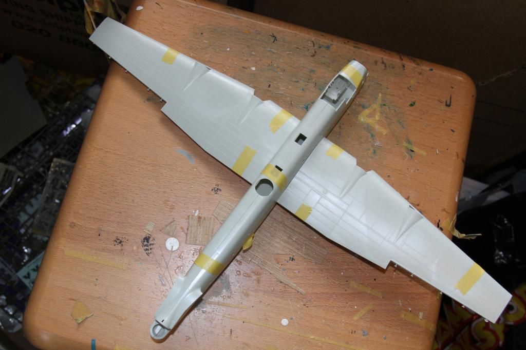 The fuselage joined halves joined and taped together to dry. Next job, the nose glazing, mainly to protect the bomb sight.