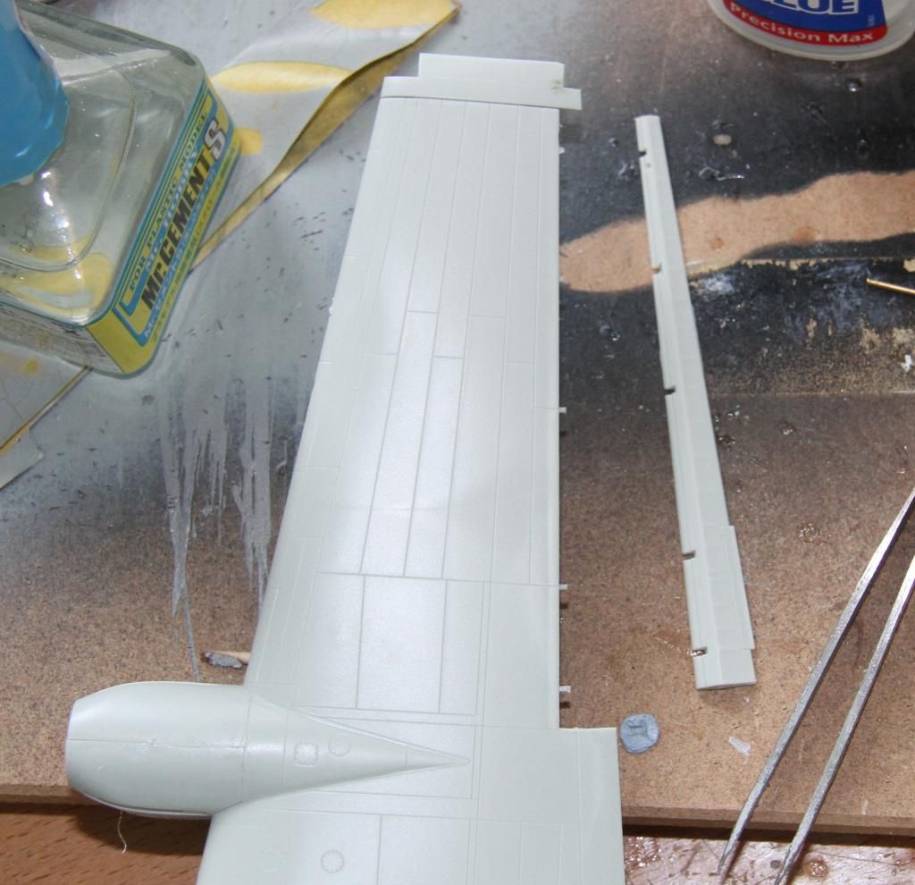 Although a recent kit, it has the old style method of trapping "T" shaped lugs moulded into the wing between the aileron halves. As I did not want movable ailerons, the end of the "T's" were cut off so the completed ailerons could be slipped into place.