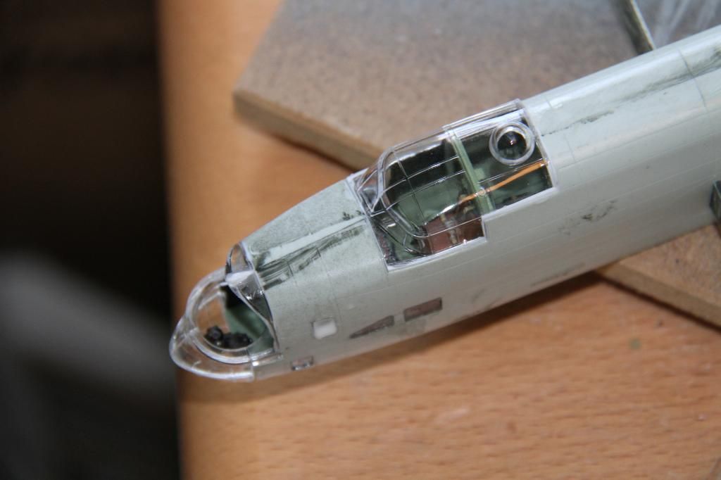 The nose and cockpit glazing in place, the window just behind where the front turret will go has been filled with Krsytal Klear as a mask, the blistered windows that will finally go there will be added after painting.