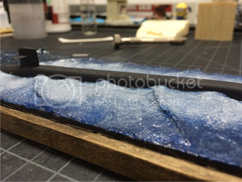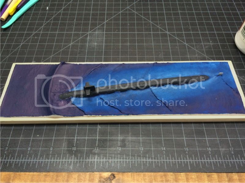 So, I apply gloss gel medium using a dabbing motion over the entire base. I make sure that the area of disturbed water has more texture than the undisturbed water. Then, over the lighter blue area I use a good quality hog hair bristle brush to dab on the white around the sub. I work more opaque closer to the sub and then lighter as you move away.