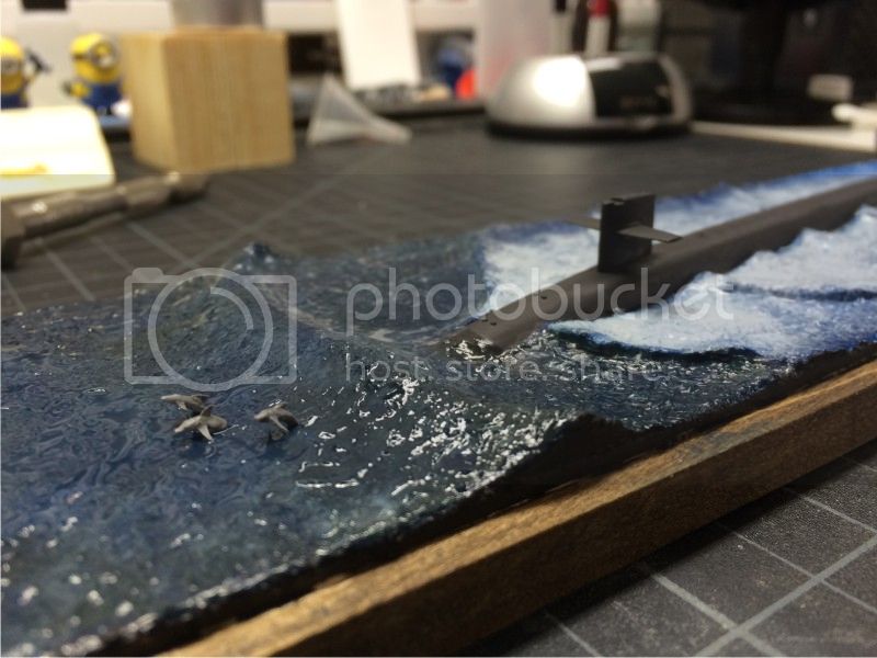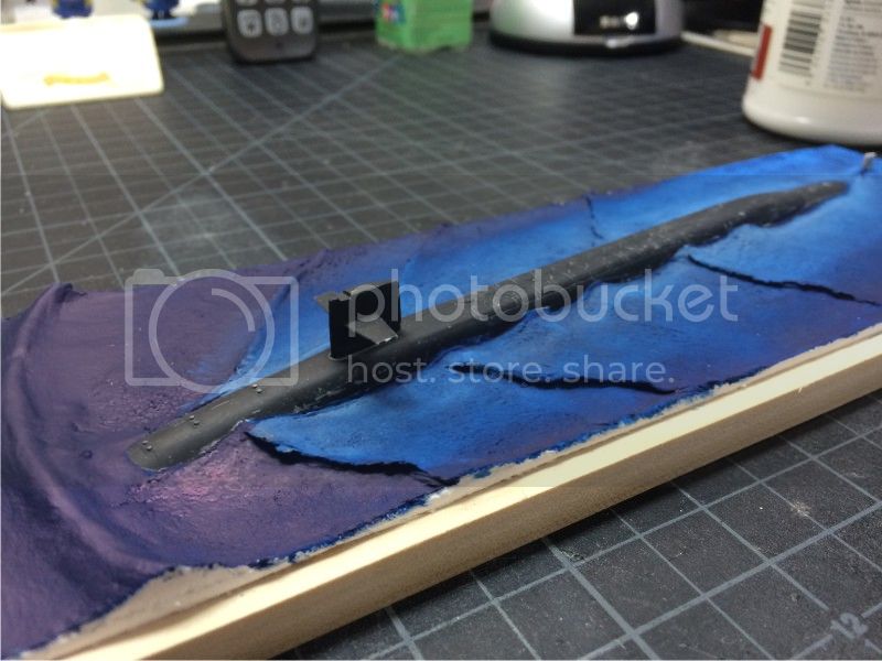 After everything dries, I give the base a coat of Golden brand Gloss Polymer Varnish. It goes on nice and thick and give a good wet look. The last thing I did was to craft three dolphins out of styrene rod and attach them to the base in front of the main swell of ocean. I dry brush some white just behind the dolphins to give the appearance of disturbed water.