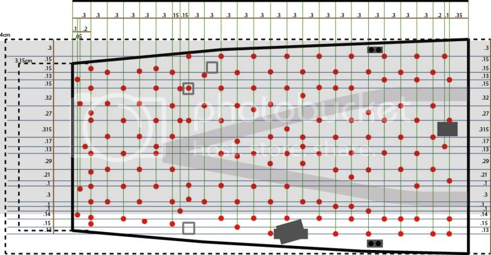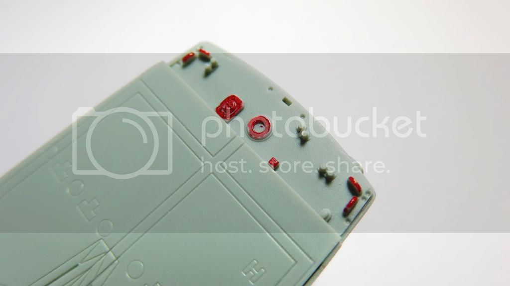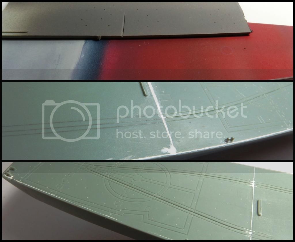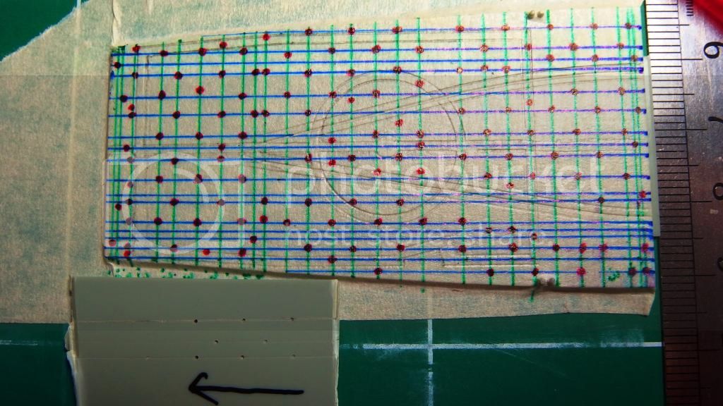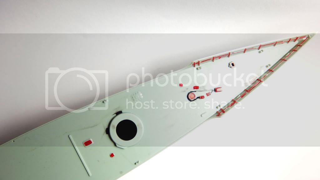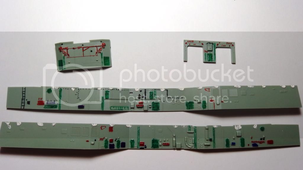 Regarding the tie down points I undertook a scientific study, as seen in the first cells of the first photo.  Deeper holes from right to left.  I decided on 1.5 turns of a .5mm drill through the masking tape after paint looked subtle enough.  I also took the opportunity to try out the colors slated for the whole model.  Grey green for the deck, light gray for hull/bulkheads, red+green for anti-fowling and black boot-stripe.  The following cells show the flight deck, I extended the rail system into the left hanger bay so that I can build it open.  Does anyone know if there are tie downs in the hanger bay as well?
