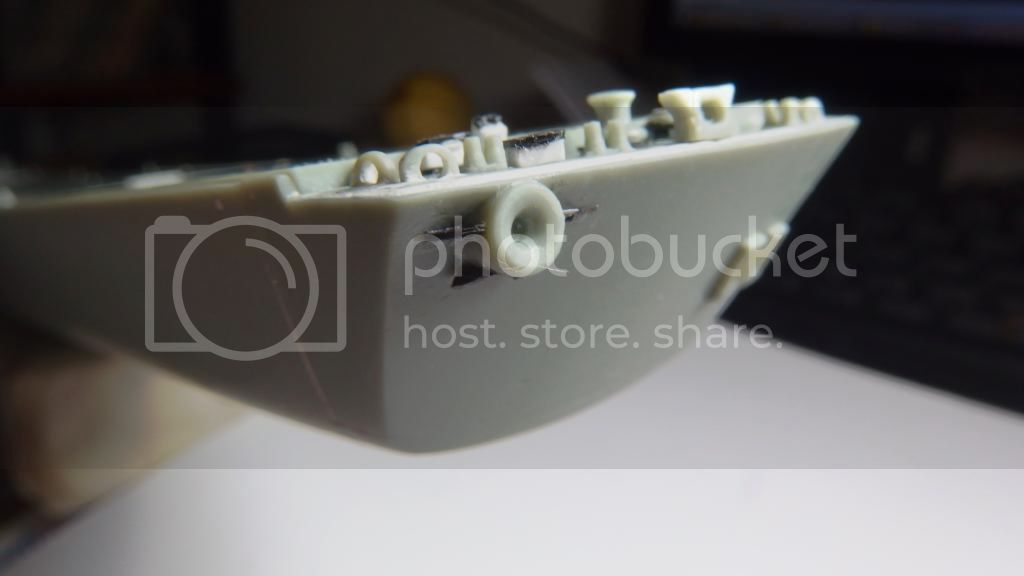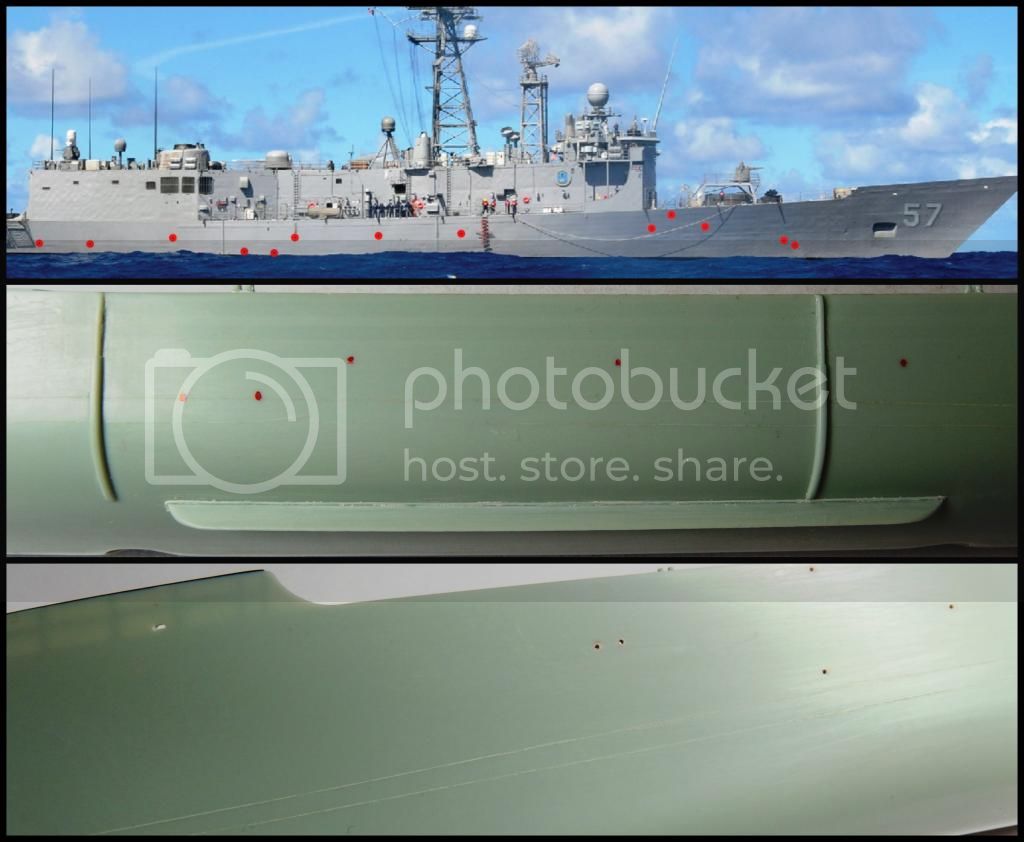 In addition I took some time to research and map out the holes in the hull for dumping various waste water.  I drilled the holes and attached the hull stabilizers and glued some stretched sprue to simulate the weld line which is pretty clear in photos.  This process is shown in the following picture.