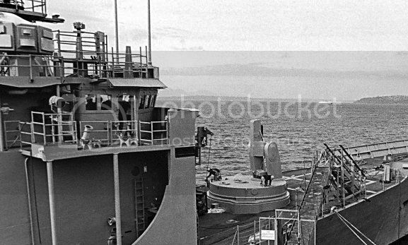 As for the ship's bell - on your big pic of the original, lower right corner between the guy's head and the orange structure, you can see a door. That's the one underneath the port bridgewing, from the passageway that leads all the way up to the foc'sle, so the picture was taken from near the Mk 13 launcher looking port-aft. What Al says 'under the bridge windows' ist absolutely correct.