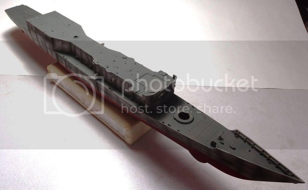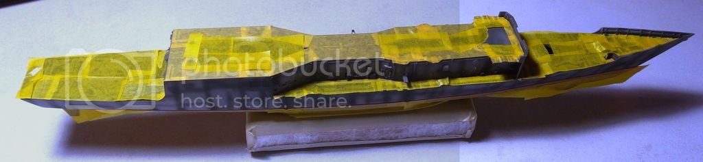 I quickly masked off the upper hull and superstructure of the ship in order to paint the red lower hull and white landing pad fore and aft.