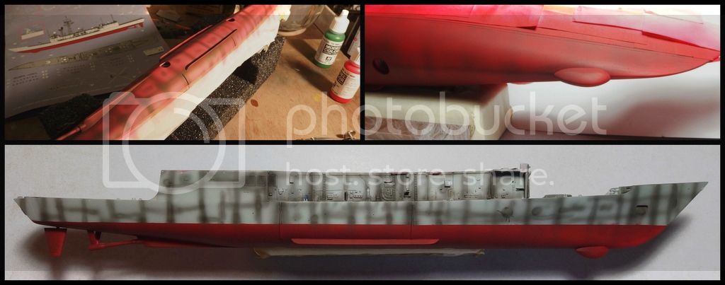 The lower hull was sprayed with a mix of red and green.  With each coat there was less green, in addition some highlighting was done on the leading edges and shadowing on the trailing.  The beauty of spraying vallejo model color is that you can seamlessly airbrush and hand brush, what fun.