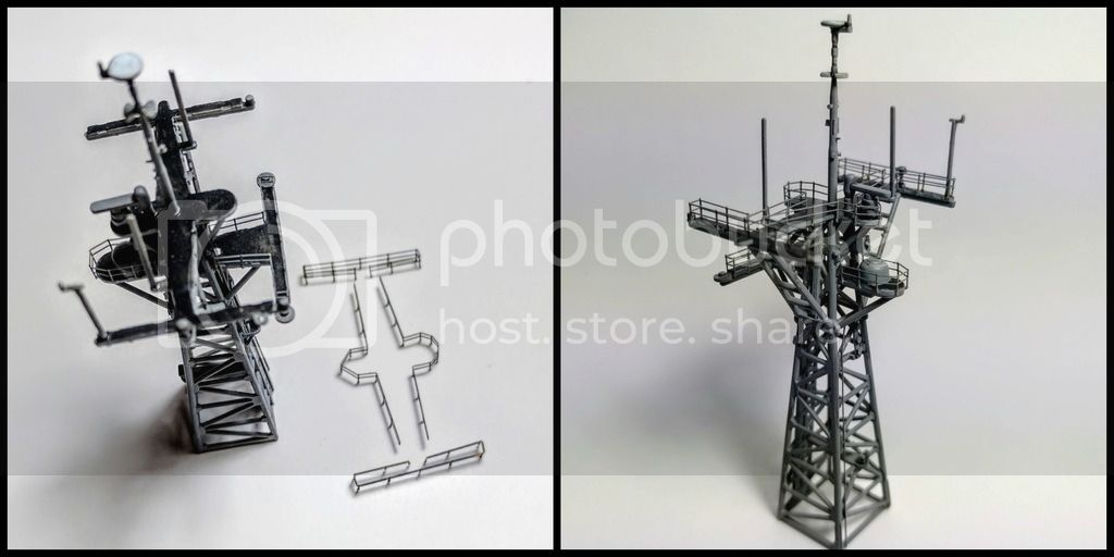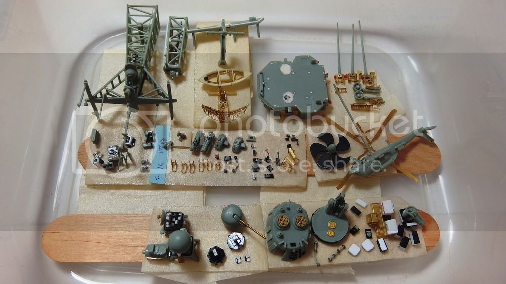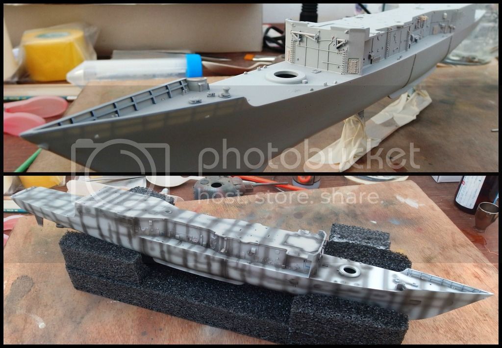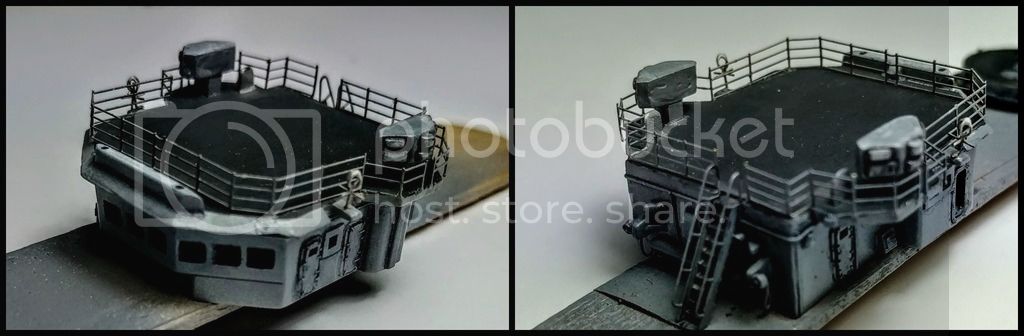 On deck I sprayed white and then masked on top for the markings.  The kit supplied laser cut masks for the aft landing pad but not for the one on the bow so I made a mask based on the provided decal.  It might have come out a little crooked, fingers crossed, masks were sealed with a coat of future.