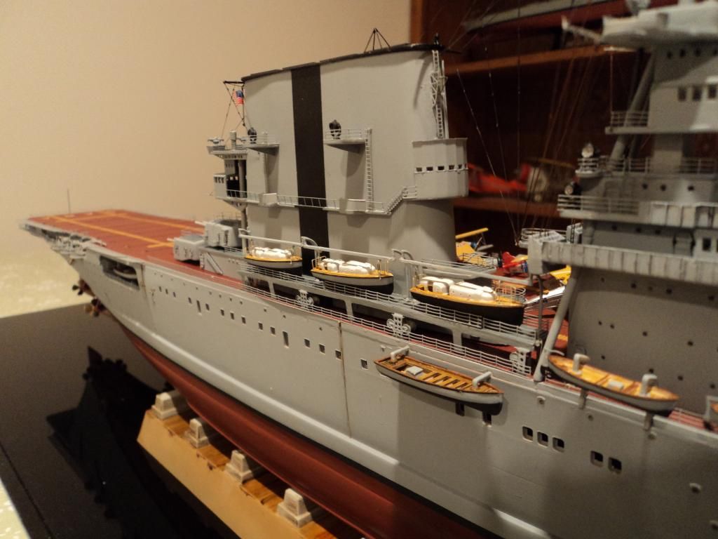 I enjoyed the build, fit problems notwithstanding. I used a lot of red body putty to blend in the lower hull with the upper hull. I added some detail to the boat pockets which is all but invisible due to the presence of boats.