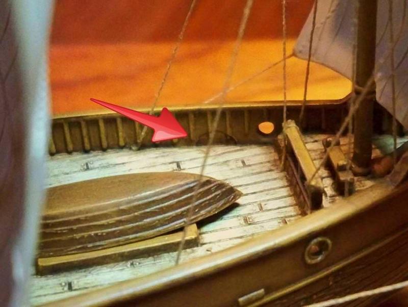 Reviewing pictures of the model after finishing up the rigging, I was irritated to discover a circular knockout pin mark on the portside gunwale I had missed when assembling the hull.
