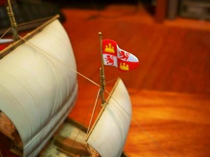 The Castilla y León swallowtail, which I had snapped off along with the top of the mizzen mast, is now back in place. I still think the two-dimensional pennant looks a little odd up close, but the flags do add some fun splashes of color to the otherwise plain model.