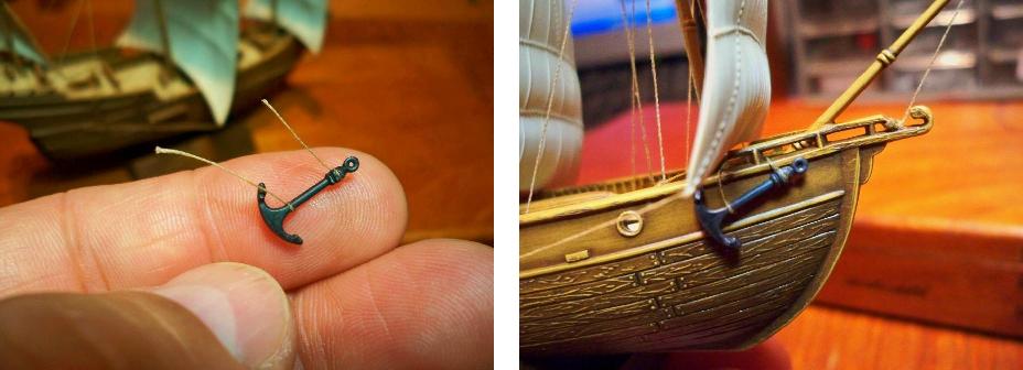 The final detail to go aboard the Pinta was the anchor. The kit was designed to have the anchors glued to small nubs which stick out of the hull, but they looked strange as they didn’t seem to be secured in any way. I added some retaining hawswers to the anchor to show how it was fixed to the hull but otherwise used the part unchanged.