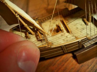 To attach these lines I tie simple slip knots on the ends, then loop them around the spars and cleats. I keep the knots on the undersides of the spars to make them less visible. Once in place I fix them with super glue. Lastly, I trim off the dangling ends and brush a little Testors Dullcote lacquer over the attachment points to kill the shine from the super glue.