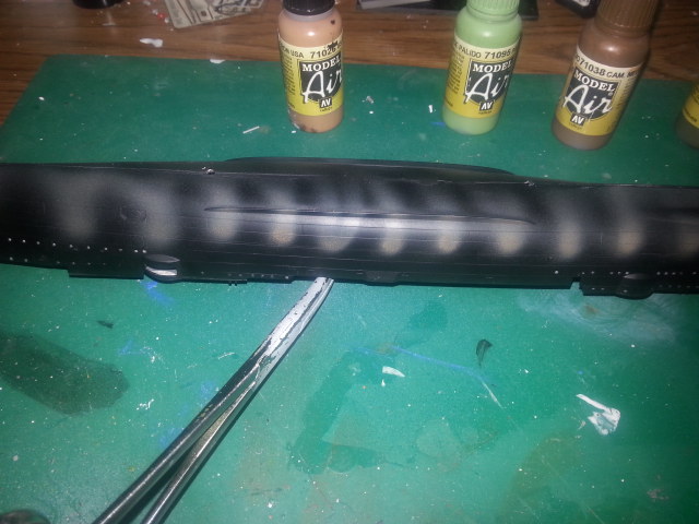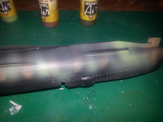 Next I did a similar pattern, but this time on the lower area of the hull using Cam Medium Brown 7138. I'm not sure if this picture is after the Medium Brown or the next color.