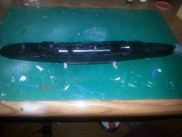 Well, it's been a while since I've last posted. I really was beginning to think this kit, the Revell Emden, had beaten me. I was about to give up, possibly even ready to buy another kit of this ship. As I mentioned I'd tried building this kit years ago and messed up the rear cut away area where the screws are. This time I was determined to get it right. I managed to get the small insert area decently lined up, but then I had a problem getting the hull to line up properly at the stern. Finally I got it to work, then couldn't get the deck to go on right!   I worked and worked on it and was ready to quit. I just set my jaw and glued it down a little bit at a time until I got it to line up mostly. With a lot of glue, and a little putty, I managed to get it to look about right. So I preceded to paint it black. This gives me a bit of shading.