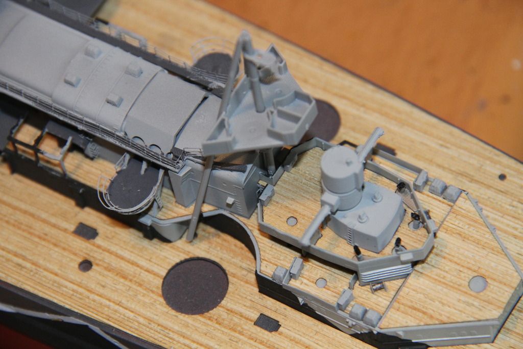 The Midships and after superstructure finally fixed down, and the four short sections of breakwater fitted around the single 5.9" mounts.
