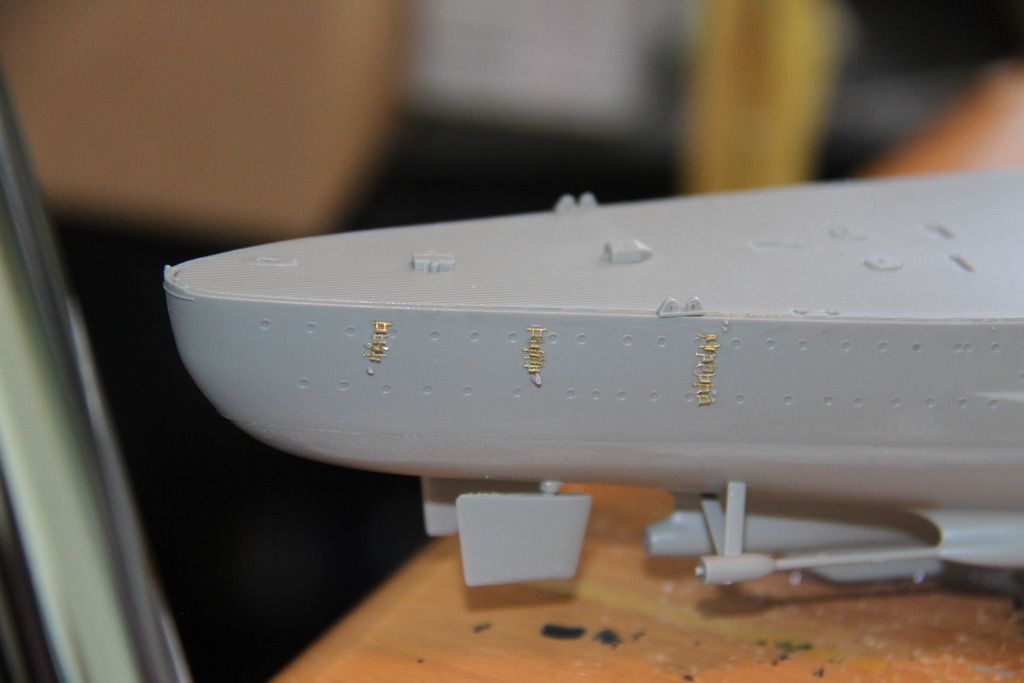 Not much in the way of aftermarket for this but I have an Artwox deck and the barrels from Dreadnought. There is a small sheet of etch with the kit. I might have to source some railings later.