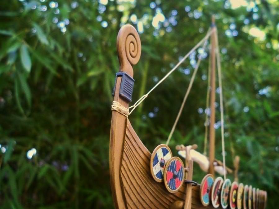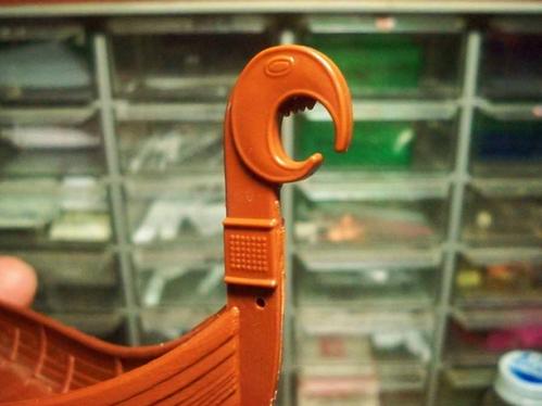 After the quick hull assembly it has been a lot of less-than-exciting parts clean up over the past few days: 64 shields, 32 oars, a two-part mast, a spar, and numerous other assorted bits and pieces... but this really is a nicely designed kit. The dragon head, for example, is apparently inspired by a real one from the 5th Century – pretty cool: