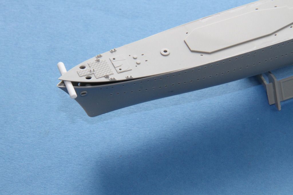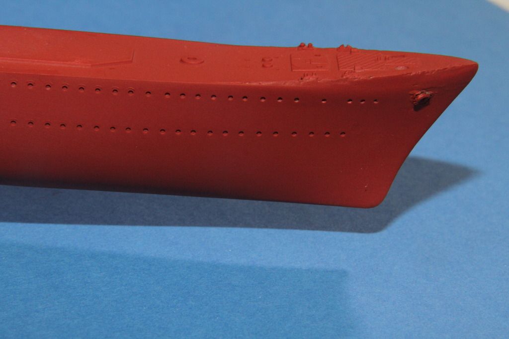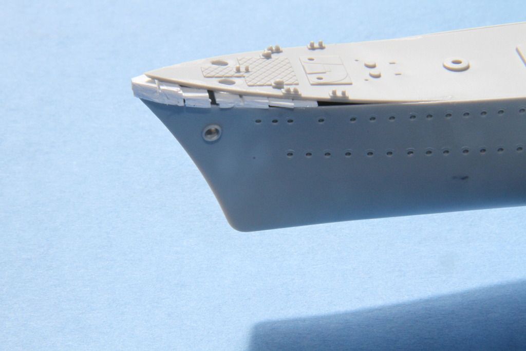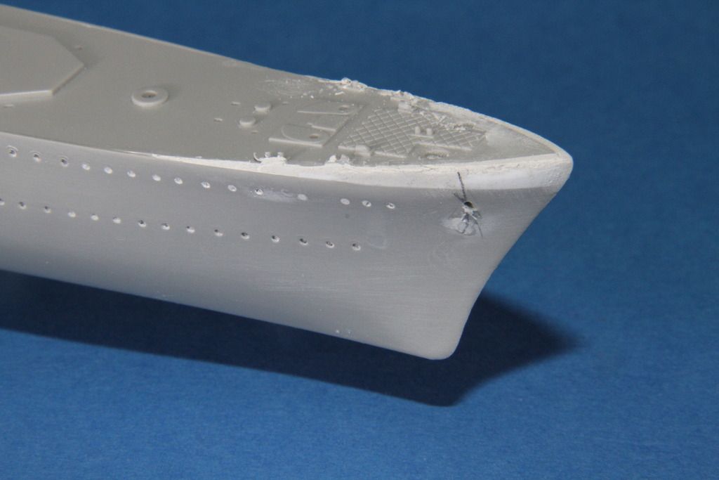 This involves raising the first 47 mm of the forecastle deck by 2 mms at the bow and fairing that in, plus relocating the hawsepipes."