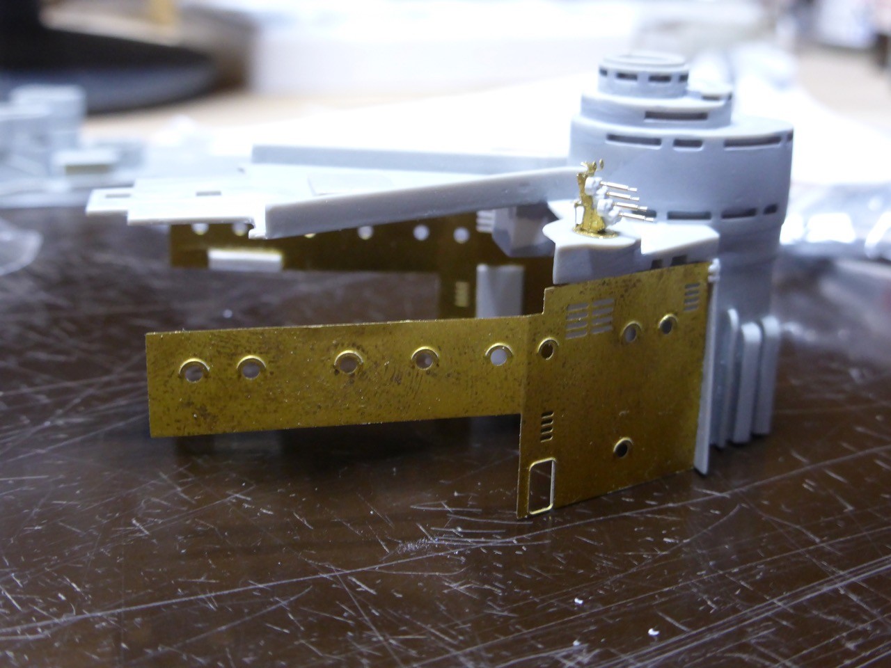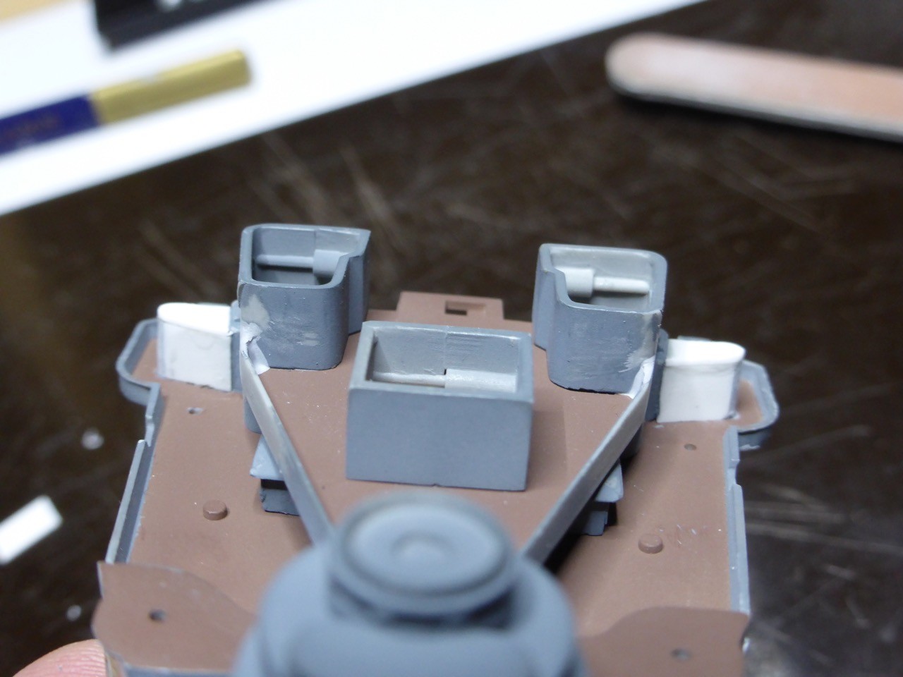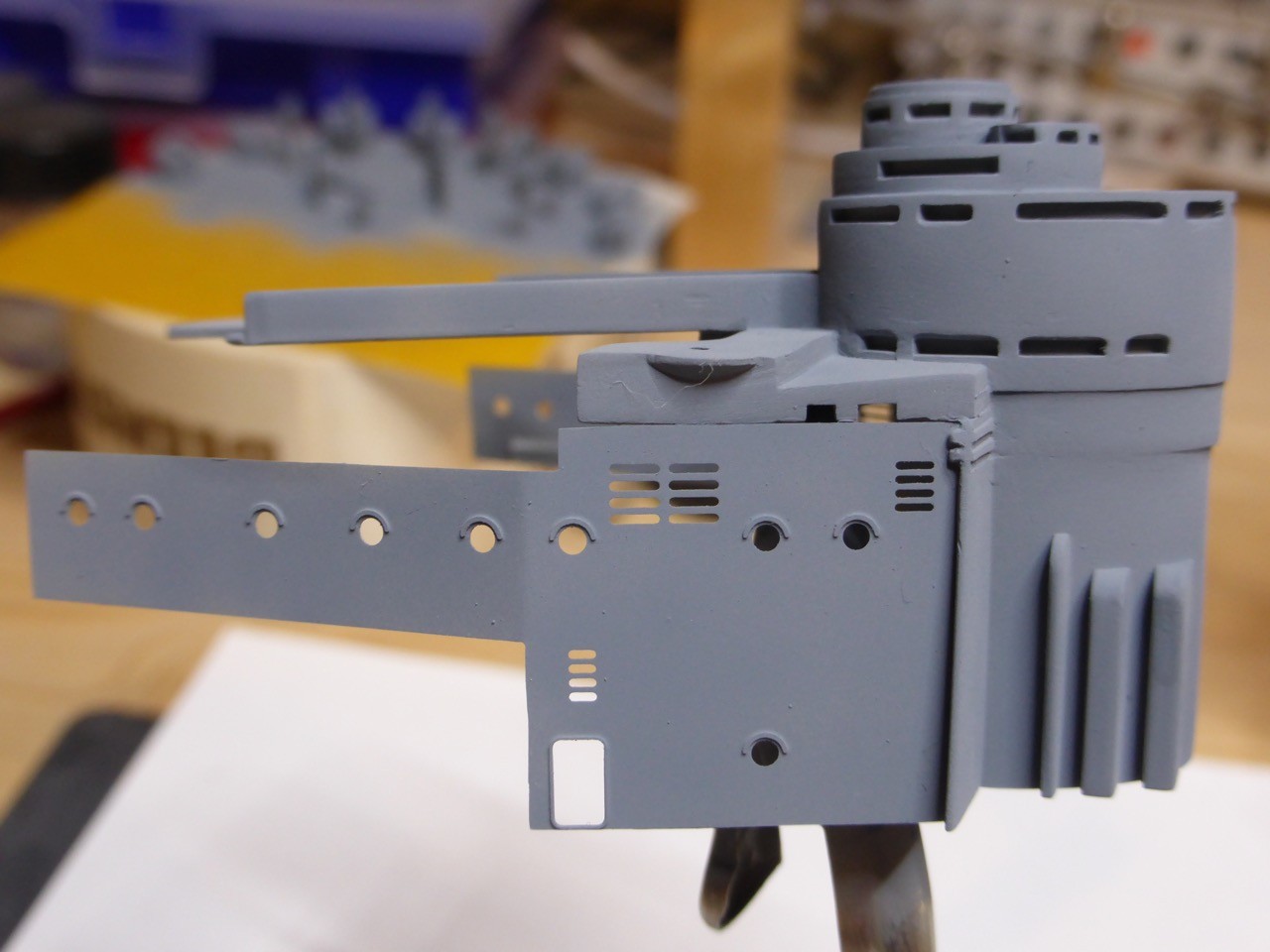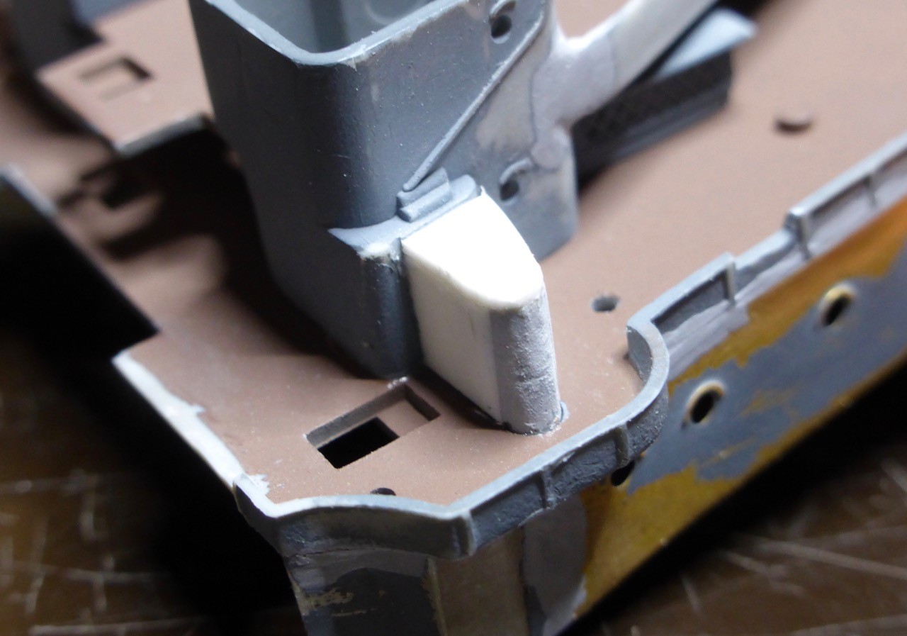 Signalmen's shelter - first approach of connecting the HACS and the bulge of the superstructure with thin plastic sheets. I am very well aware that the shape of the shelters is not correct - I should have removed to bulges first, there was no 'V'-shape pointing forward. But I assume once installed together with all the stuff that will be on that part, it will be hard to realise.