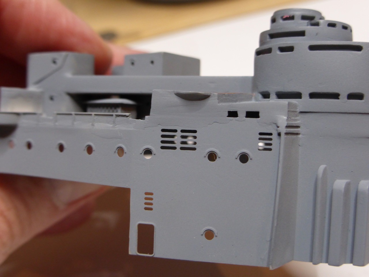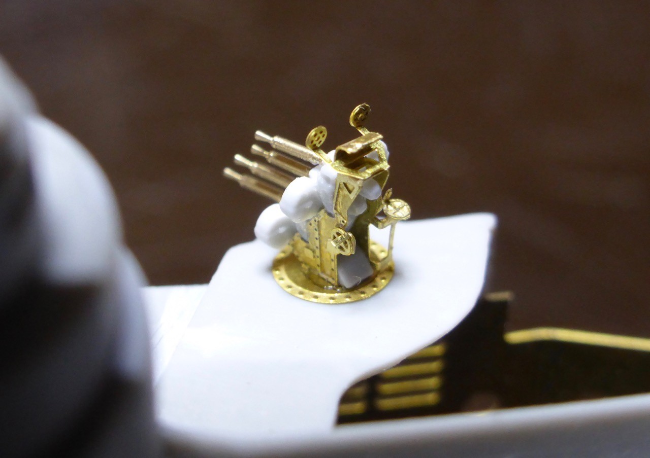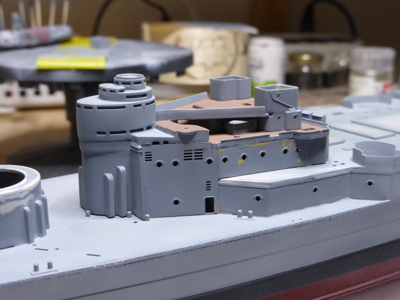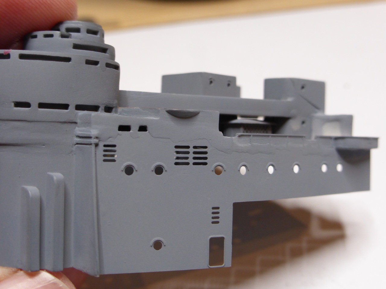 Signalmen's shelter - first approach of connecting the HACS and the bulge of the superstructure with thin plastic sheets. I am very well aware that the shape of the shelters is not correct - I should have removed to bulges first, there was no 'V'-shape pointing forward. But I assume once installed together with all the stuff that will be on that part, it will be hard to realise.