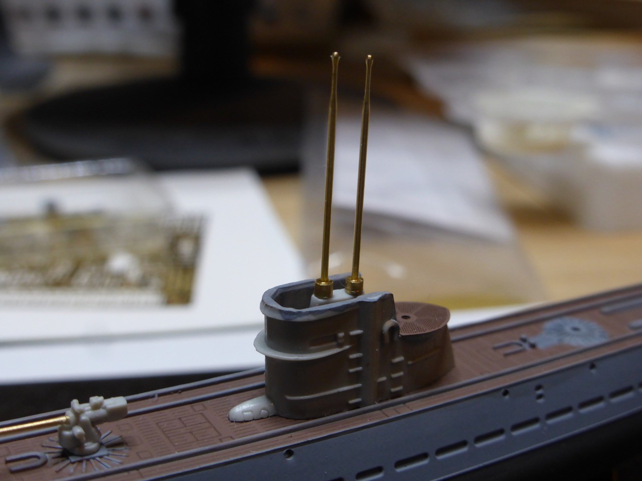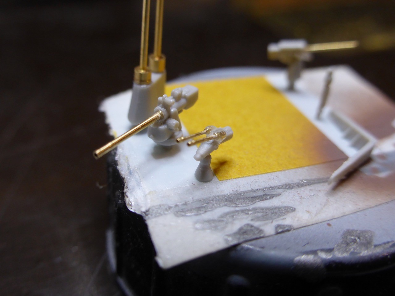 Propellers on, and work done on the guns. I decided to go mostly OOB, and replace only the barrels with turned brass ones. And I used the PE provided in the kit.