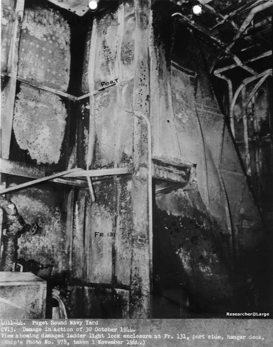 One comment on the AOTS Intrepid book plans - they're not dated but include the hangar catapult. This means they are early in the ship's WWII service, which explains why the stairways from the hangar deck to outside doors are labelled "open to hangar" (Look for #9 on plans A7/1 & A7/2 on pages 42 & 43 and #4 on the next set of pages). Those were ordered enclosed in mid 1943 and this enclosure was referred to as a light labyrinths or light lockers. They essentially just wrapped light sheet metal around an inclined stairway to enclose it and trape light. Note that the memo orders flat black paint used for 20' around the lower opening, but I've never seen a photo clear or far enough back to demonstrate if it was circular or square.