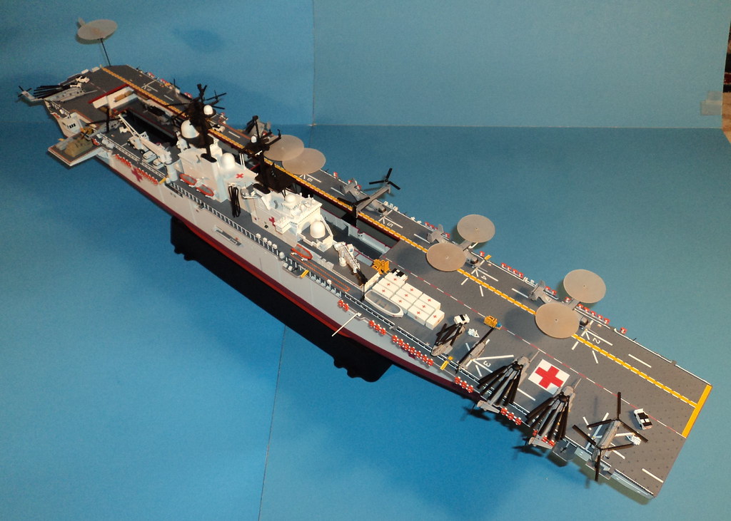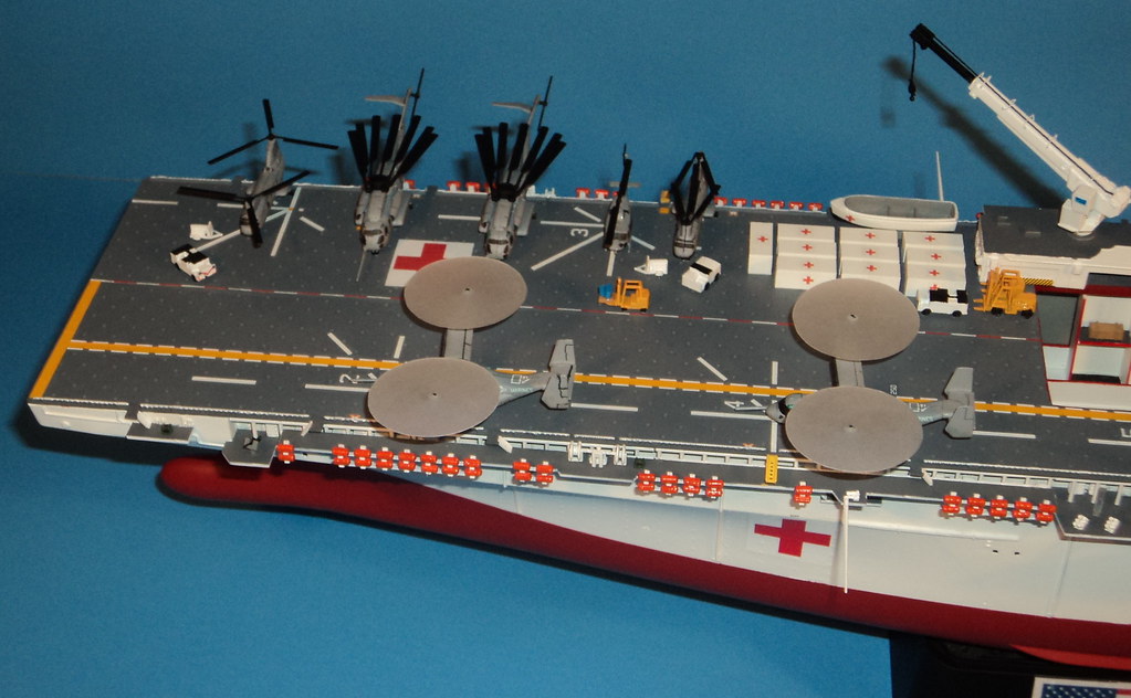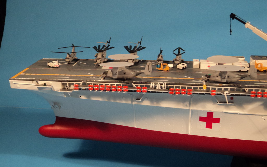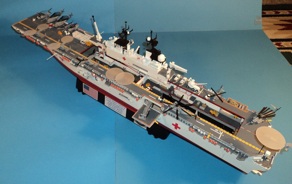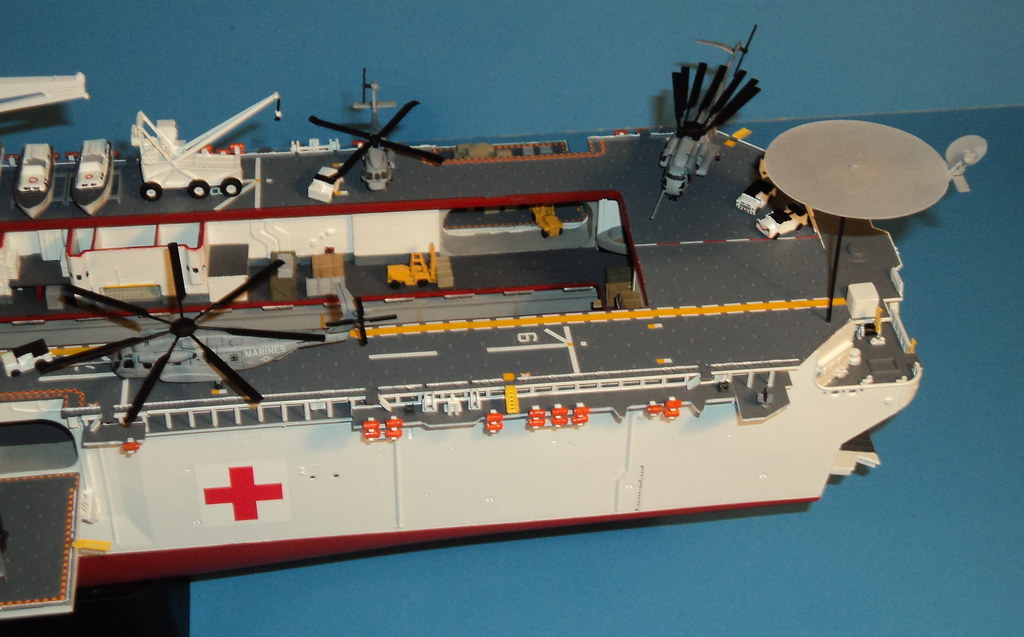 Here is something I've been working on the last 2-3 years. A 1/350 scale Gallery USS Wasp amphibious assault ship converted into a What If? hospital/humanitarian relief ship.