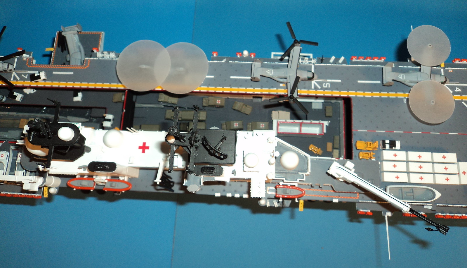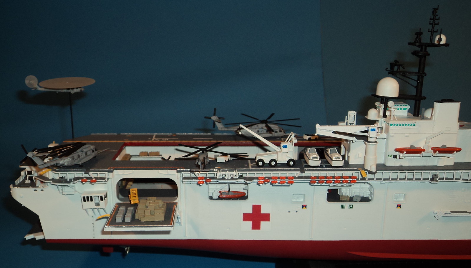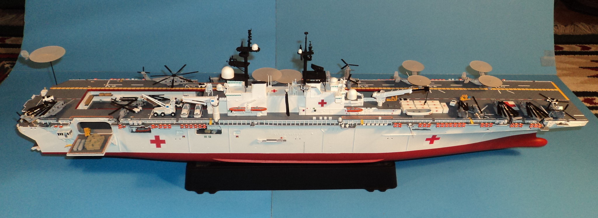 Here is something I've been working on the last 2-3 years. A 1/350 scale Gallery USS Wasp amphibious assault ship converted into a What If? hospital/humanitarian relief ship.