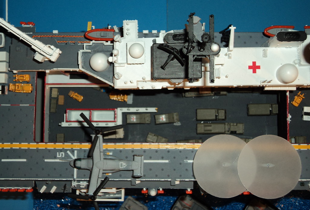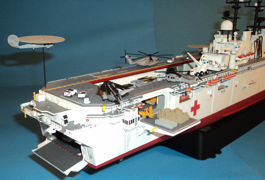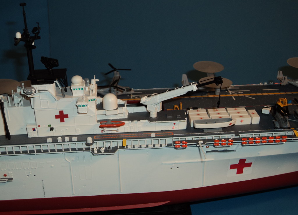 There's an organisation called Coalition of Hope. They have a website where they proposed and discussed the possibility of buying and renovating the old USS Nassau amphibious ship for humanitarian purposes. This is the site where I got my inspiration from to make my model. Well......partly. But I also did it because I had read that the US Navy Military Sealift Command's MERCY class hospital ships were 40+ years old and needed to be replaced. An LHD would make an interesting replacement.