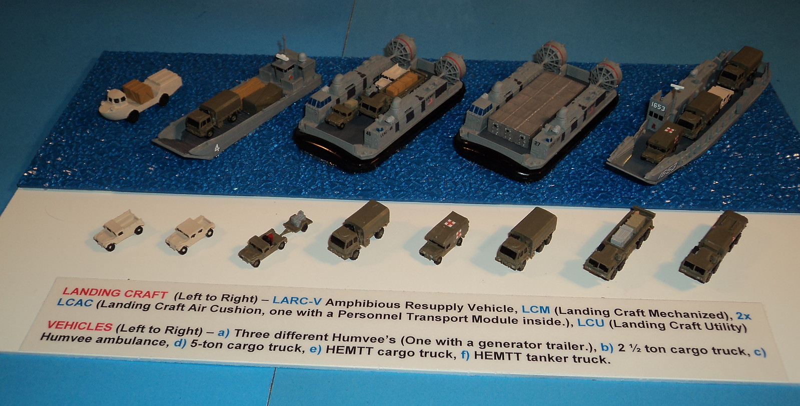 2. All other aircraft, vehicles, ship fittings, etc. painted in a variety of Testor Model Master Acryl or Tamiya paint colors.