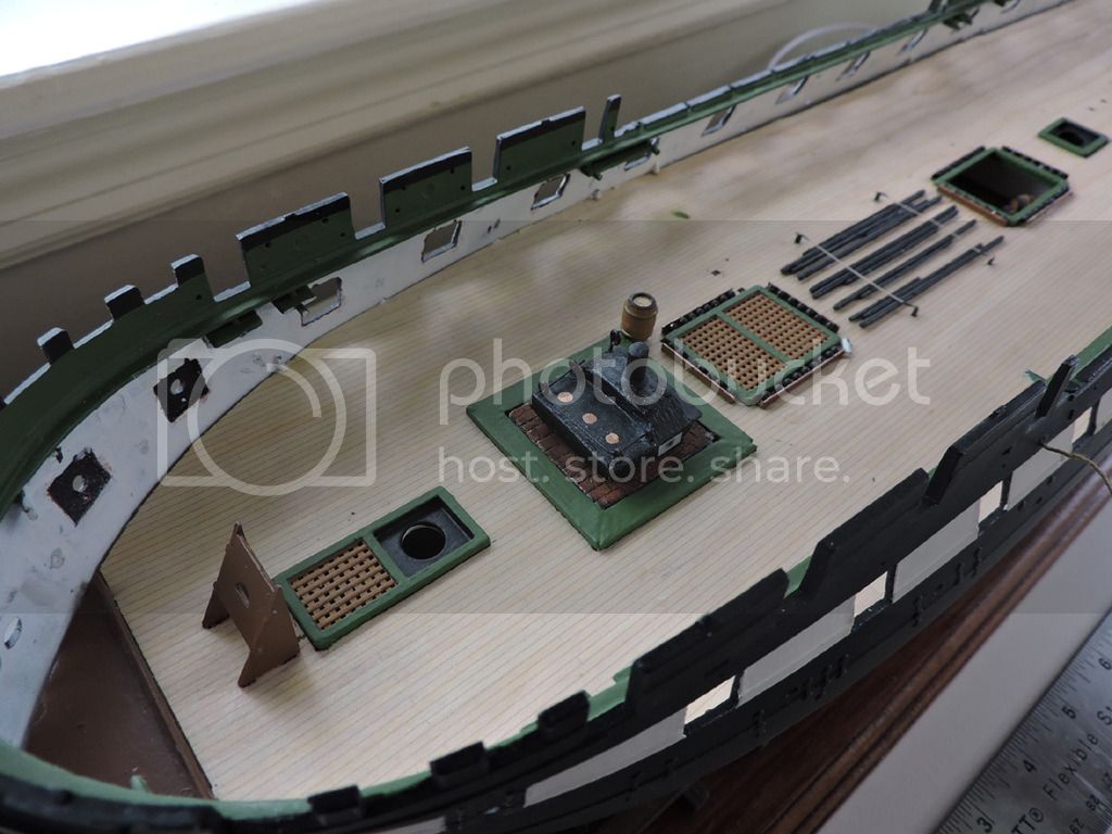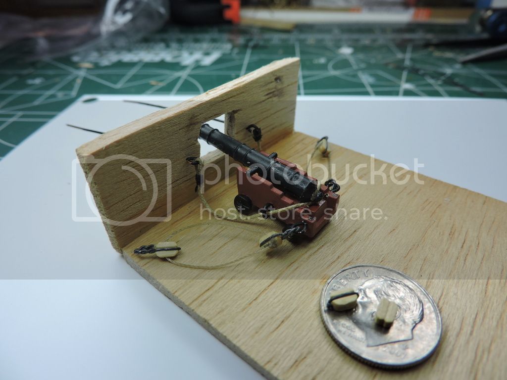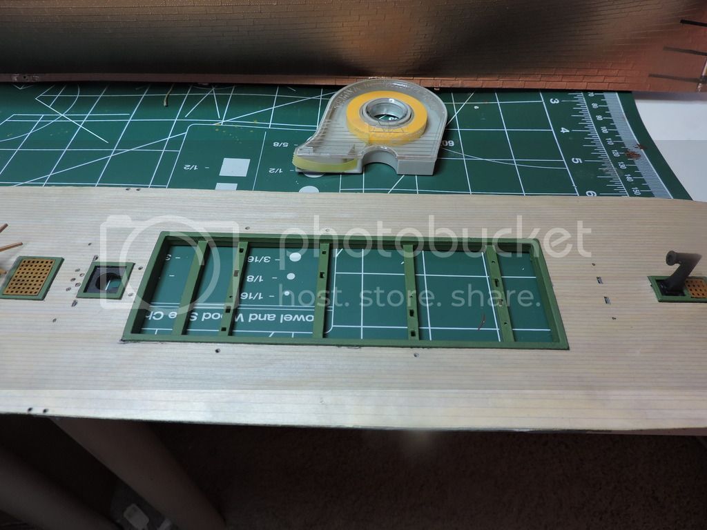 I had seen a base online that someone had and I went with that design. Purchased my base at Michael's Crafts and 1/4" and 1/2" square wood strips at Lowes. Sanded and stained base with Cabot's Autumn Glow and cut 1/4" into 4&1/4" lengths and stained with Testors CreateFX Flat Black wash. Cut 1/2" strip into two 20" lengths and stainded with the Cabot's. Drilled holes through base and hull of ship. Routed a path in base to conceal wiring for interior lights and covered with green felt. Used two bolts with washers and nuts to attach ship hull to base. A 3rd hull was drilled through the hull for my LED wiring and would then be hidden with the 1/2" runners on base. Lighting has a dimmer switch and will plug into wall. I also painted the bulwarks green by mixing Model Master Green Zinc Oxide with Dark Green and a little Testors Flat Green.
