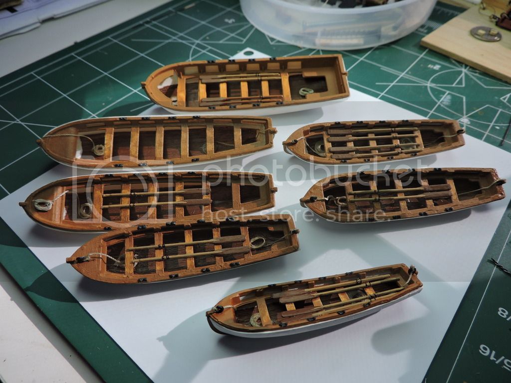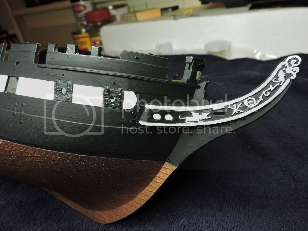 Cut and sanded any flash from two hull halves. Glued together using CA glue and clamped together. Ran a heavy bead of CA glue along the entire keel on inside of ship to strengthen the connection. Used gray primer inside and out on hull. Sprayed Flat White on inside hull and along gun ports. Taped lower part of ship and spayed upper portion with Gloss Black. Finally, after drying, I taped off upper portion of hull and spray painted lower hull with Copper.