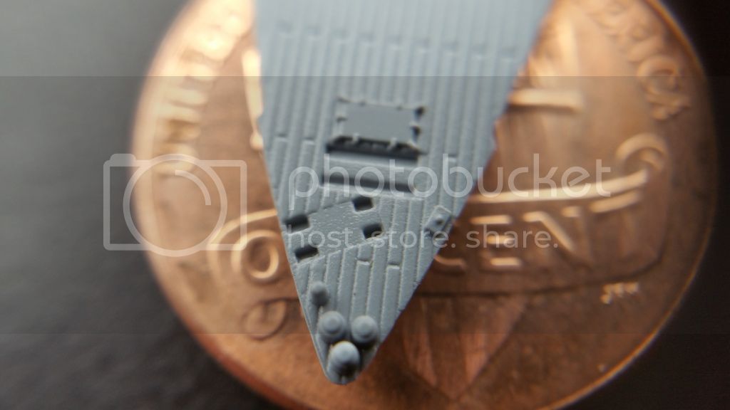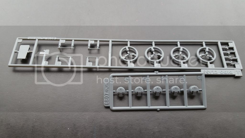 The last sprue is on a card, and sealed in a bag. It contains all the guns, some life rafts, and other incredibly small, and detailed parts. The search lights and signal lamps in particular have incredible cast detail.