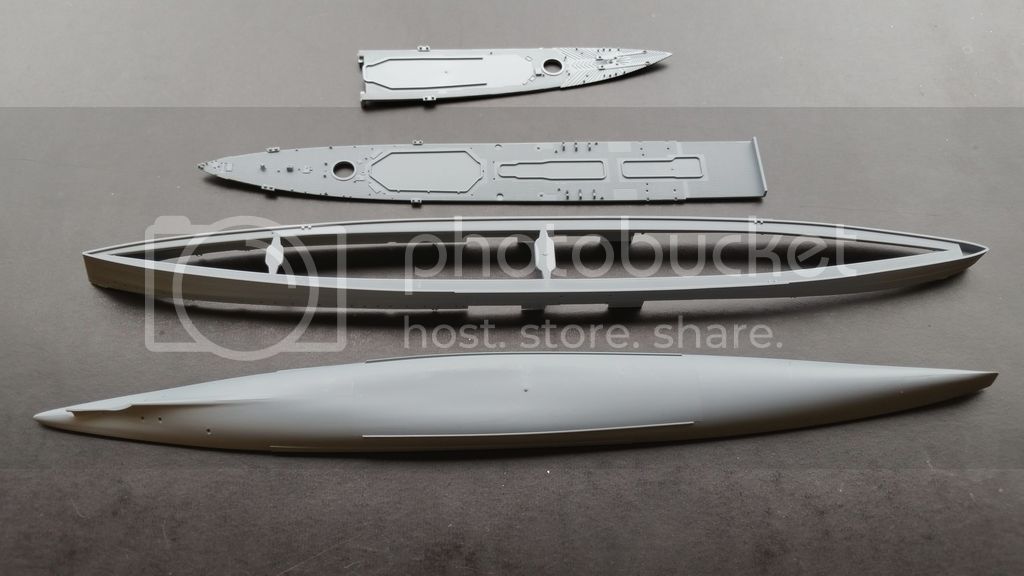 Moving on to the plastic-bits in the bags, let’s start with the hull. It is packaged in a bag that contains the main deck pieces (2) and the two-part hull—which is rubber-banded together. This model is also able to be displayed as a waterline kit, so the hull is split at the waterline. It is well cast, and the joint between the two halves appears near-perfect. I doubt any filler will be required along this seam. I will more likely than not drill out the tiny portholes and scuppers along the sides.