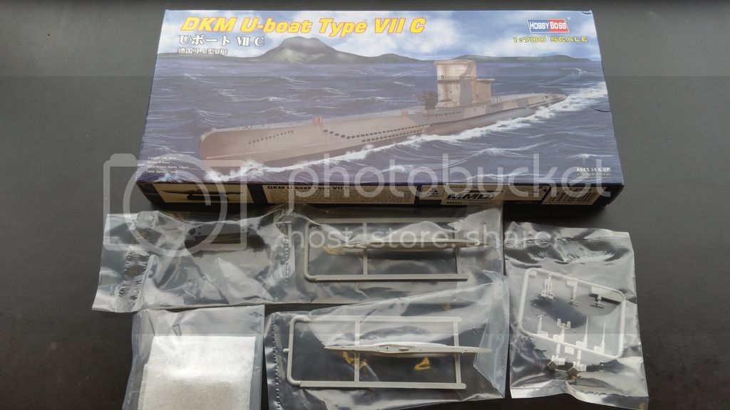 I’ll be building her for static display on a teak base, secured by a brass rod. Underneath her, lurking, will be a 1/700 Hobby Boss Type VII C U-boat representing U-565, also in her wartime camouflage.
