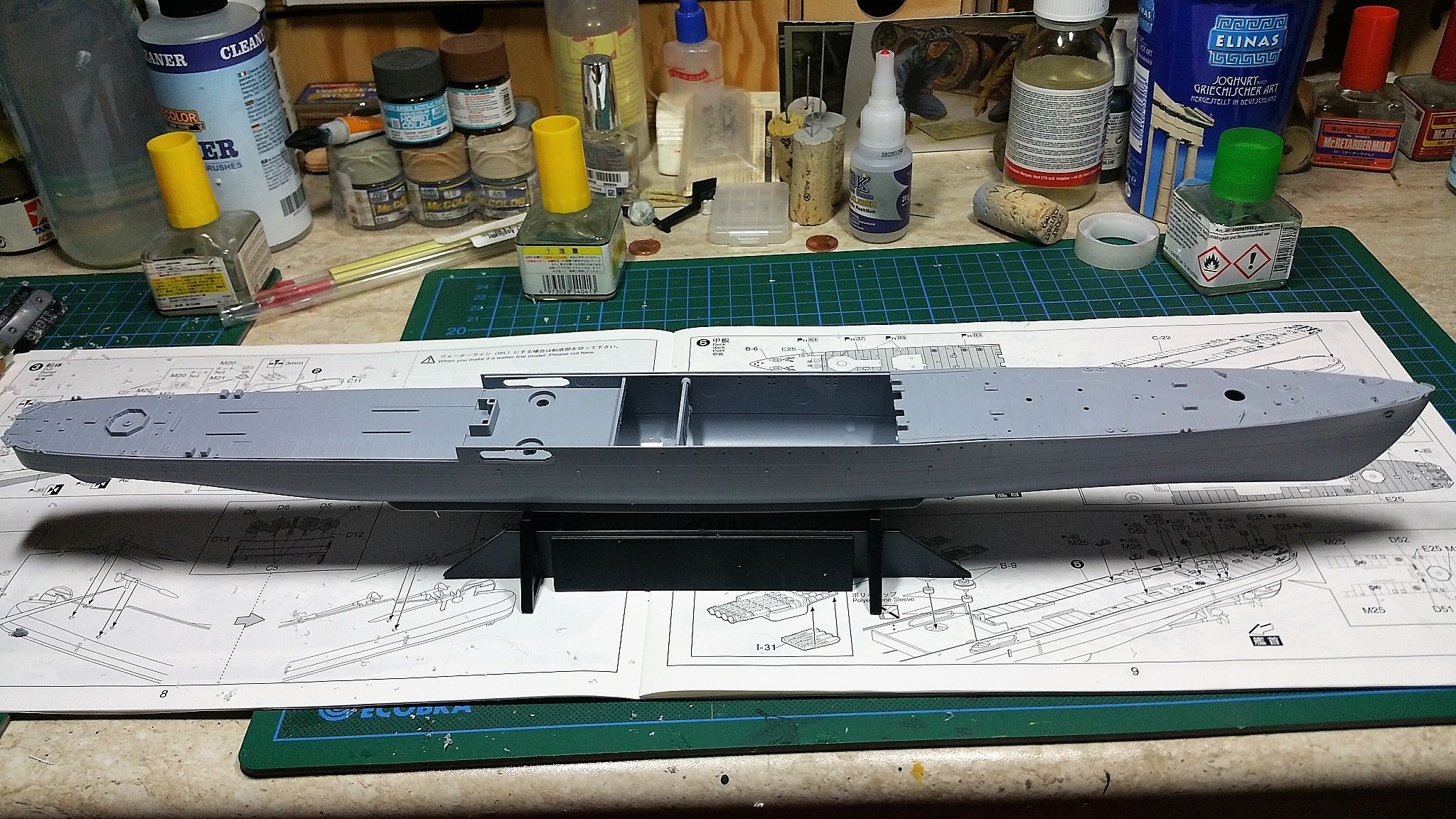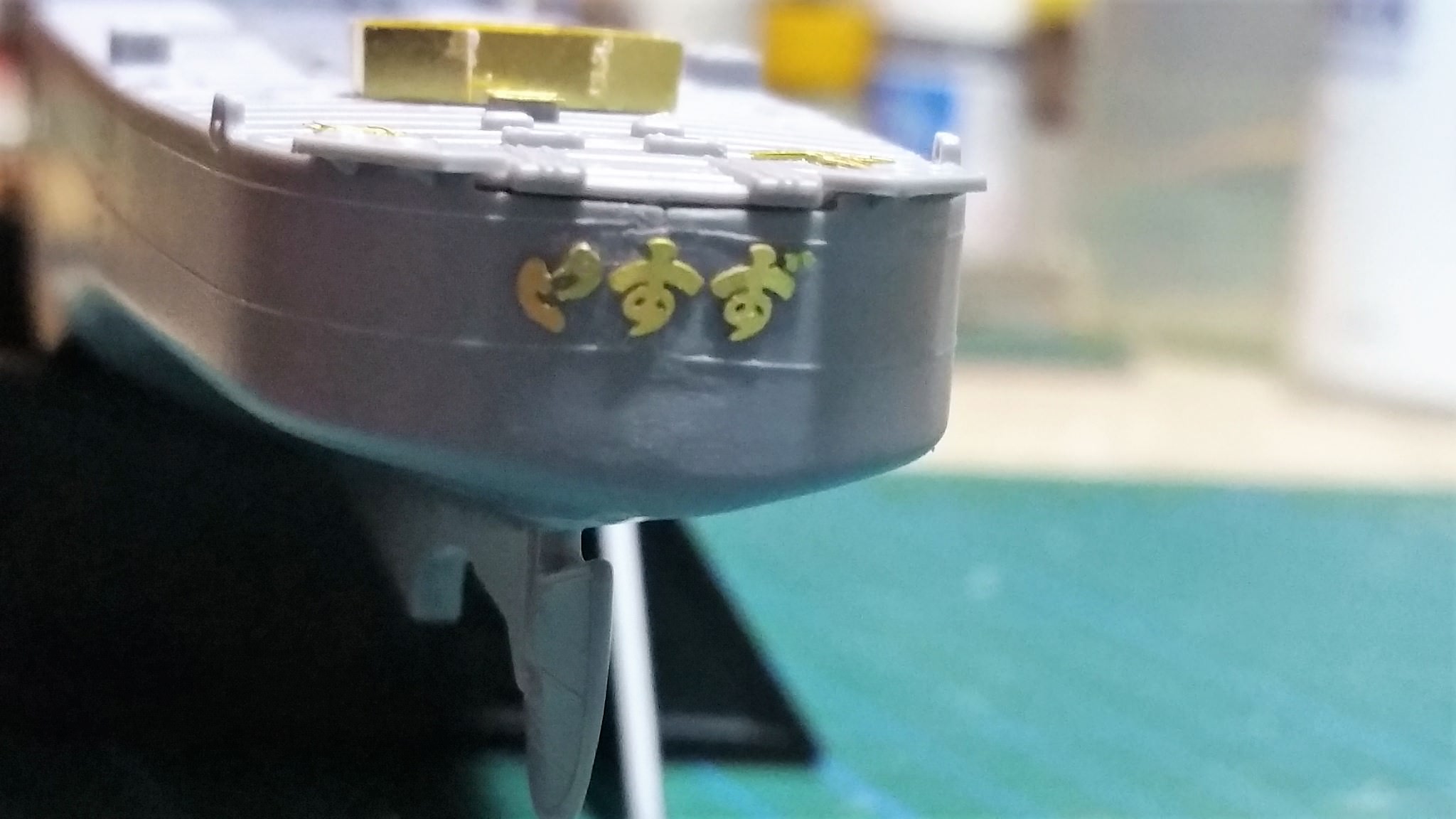 Therefore I opted to overpaint it with another, more appropriate, color. Luckily I do also own Gunze´s IJN Arsenal Color set with three different gray shades of Kure, Sasebo and Maizuru Naval Yard. All three are just a tad different in its color shade but does look more appropriate for the ship in my eyes