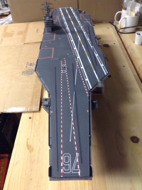 Here is my USS Ronald Reagan deck bow-on. Still have quite a few tweaks. Need to add the ordnance jettison ramps, re-do the signal flag lines (use thinner line), and a few others... Oh, and maybe add a few planes... Hopefully, will get some photos of the hangar deck with the lights on posted this weekend.