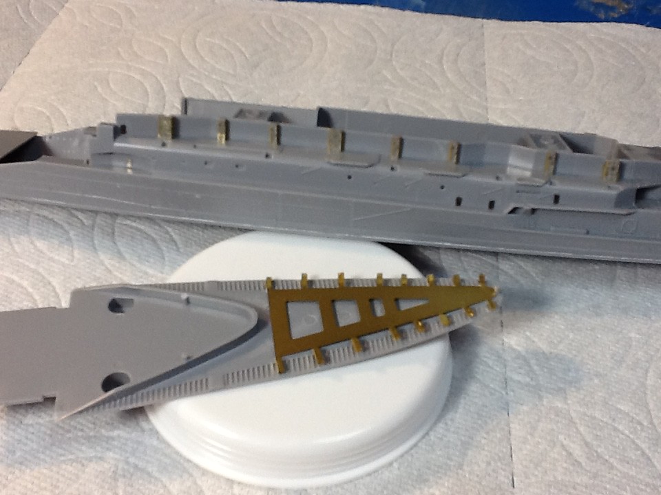 I haven't decided yet if I will use the PE flight deck supports or use the ones that came with the kit. TOM's model works PE is so flimsy that I am afraid I will bend them up sitting the decks in place. I guess a couple of test fittings will help me decide.