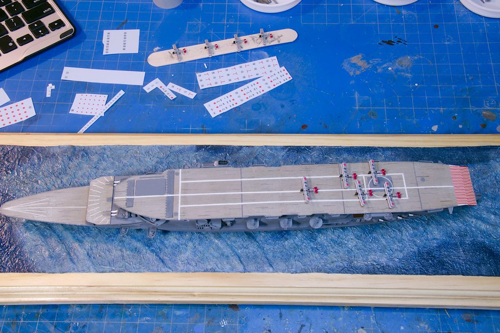 I have one more set of strips to lay follow by three more coats of paint, clear coat and wash. First time I tried this on a 1/700 model. I am completely winging it.