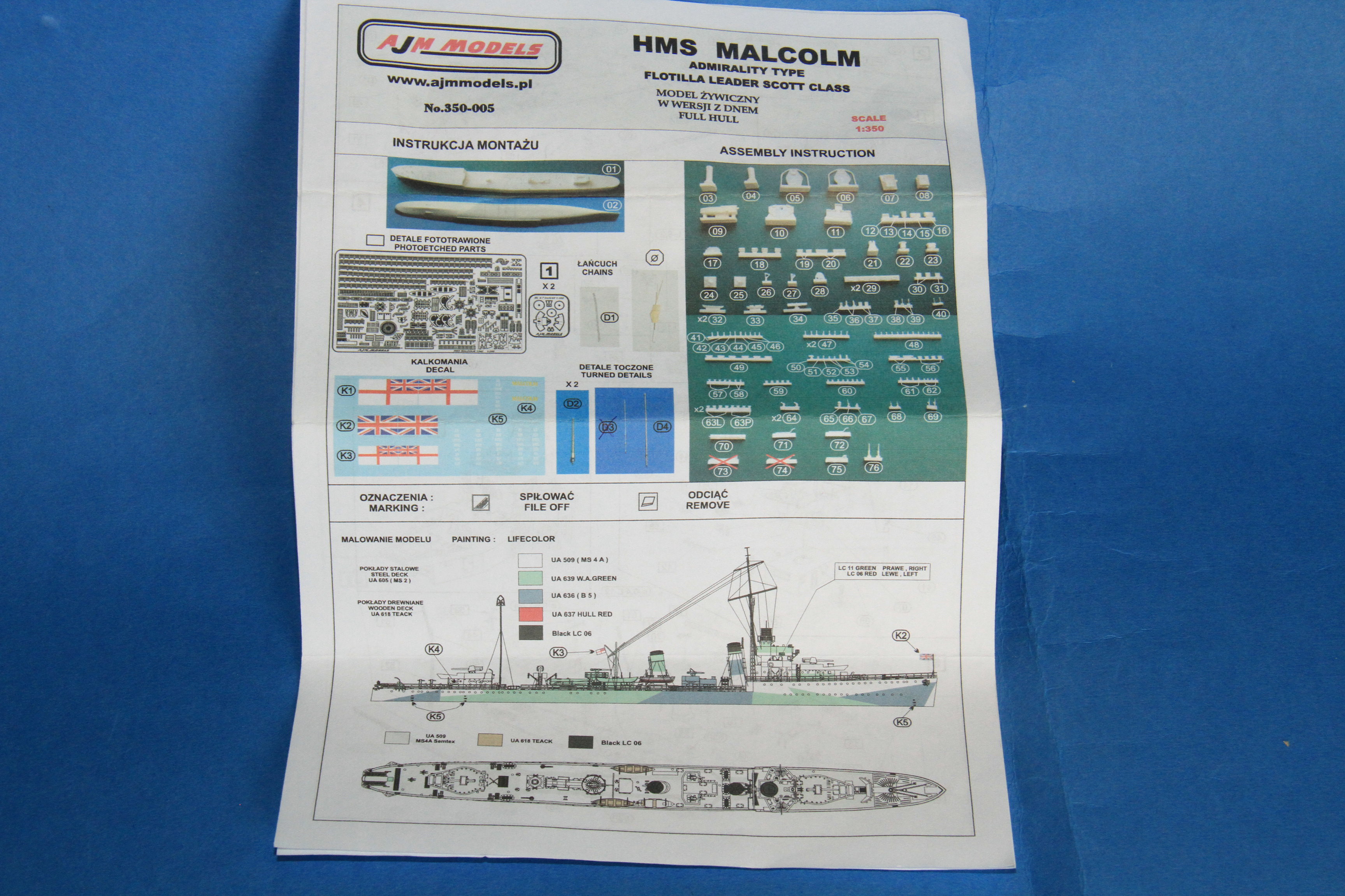 HMS Malcom was an Admiralty type flotilla leader built late in the 1st World War, most commisioning after the end of the war, they were enlarged verions of the V/W armed originally with 5 4.7" guns. The kit reperesents HMS Malcolm in 1942, when she had be converted into a Long Range Escort.