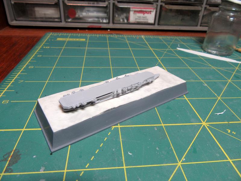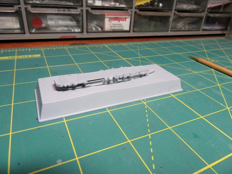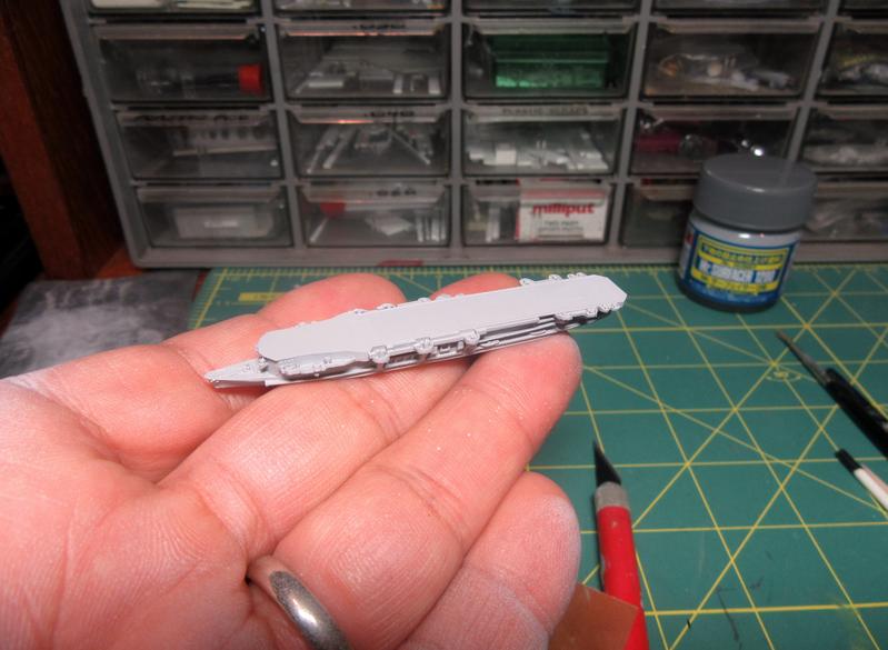 Other than cleaning up mold lines and a small amount of Mr. Surfacer to smooth the seams, the only alteration I made was to omit the solid-molded flight deck supports aft (which will be replaced later with plastic strips). She now wears a coat of Tamiya rattle-can Light Grey primer.