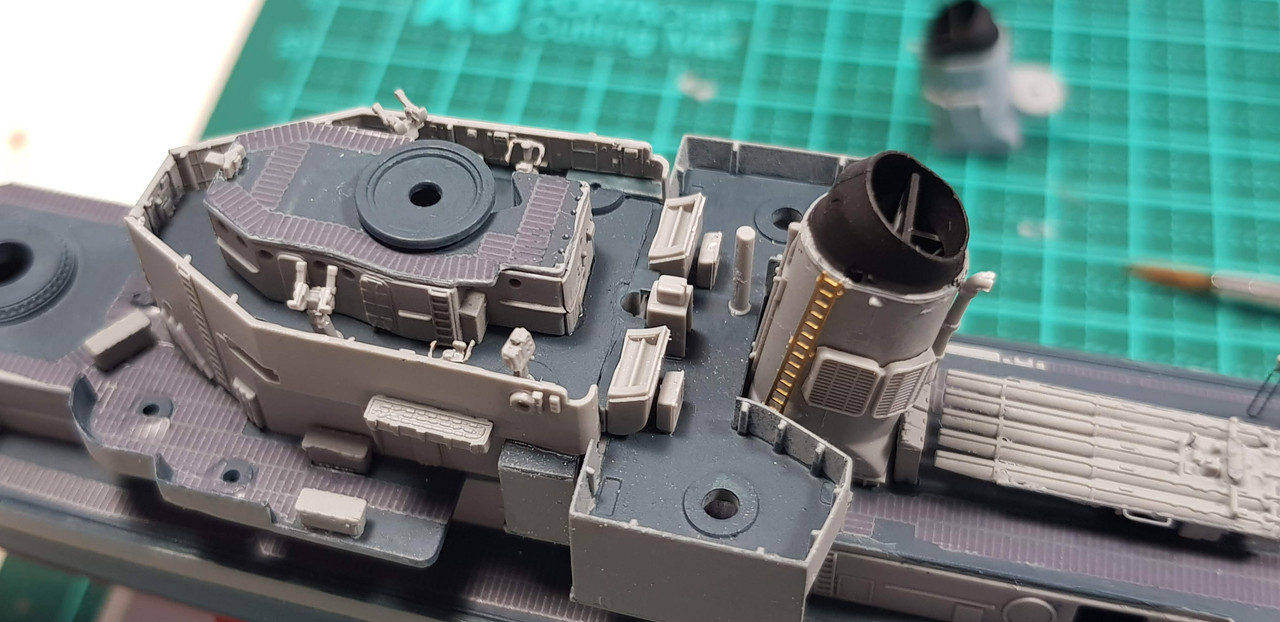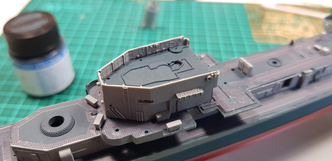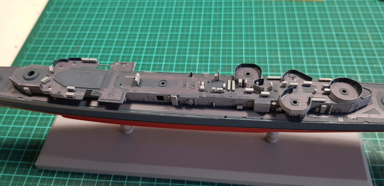 Only a couple of photos but some major advances withe the model. First deck of the superstructure is on!