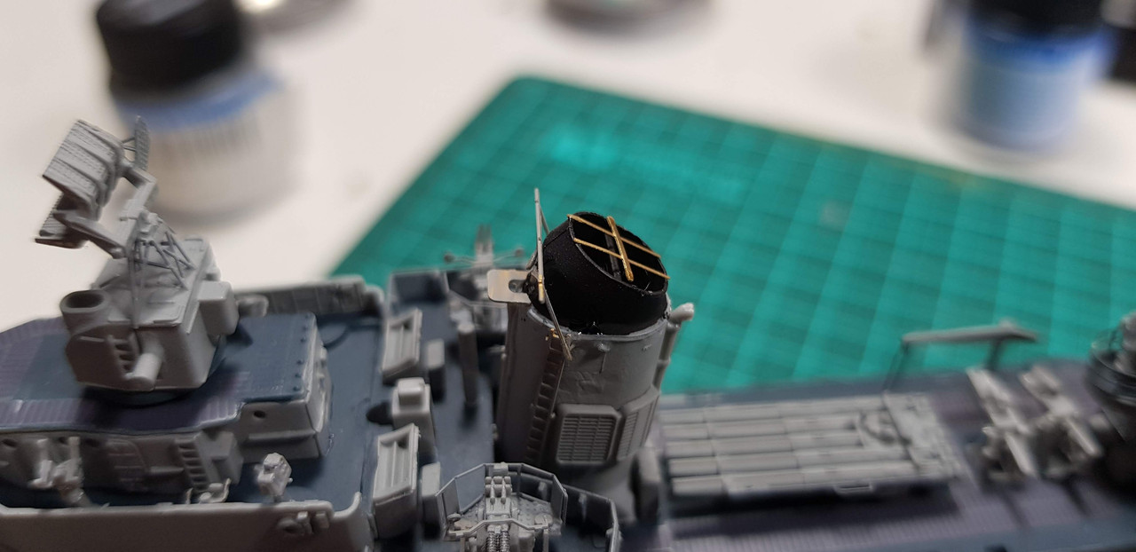 I realised today that I have been thinking WAY too deeply about these paint colours. The colours of ships vary so much after the leave the dockyard it is almost impossible to accurately reproduce colours. Then you have the trouble of having to use unfamiliar paints to replicate colours. I tried Lifecolor Haze Grey on my ships railings and it clogged up many of the tiny holes in the netting as you have to spray it from a larger orifice airbrush as it just clogs up my fine ones.