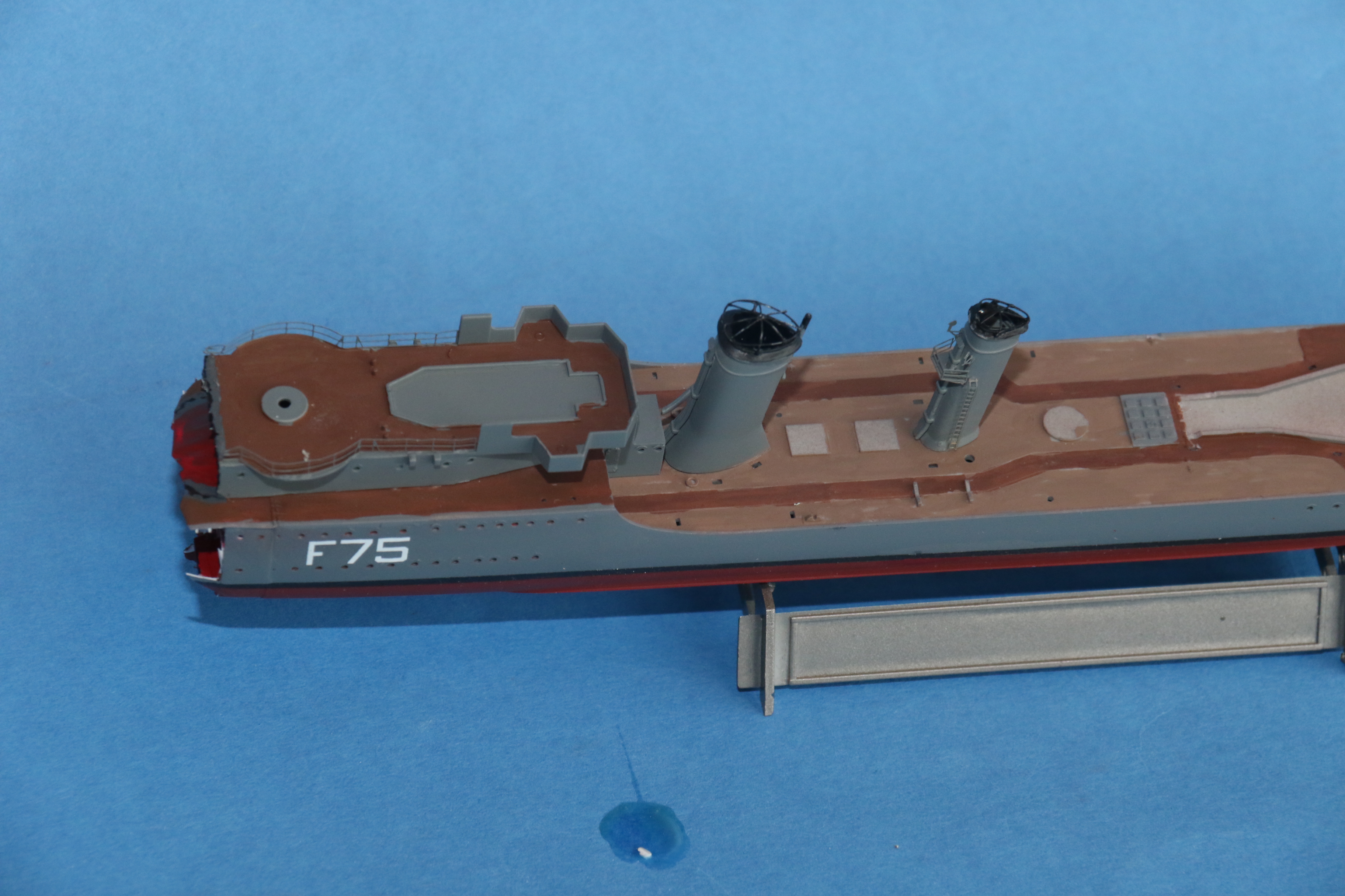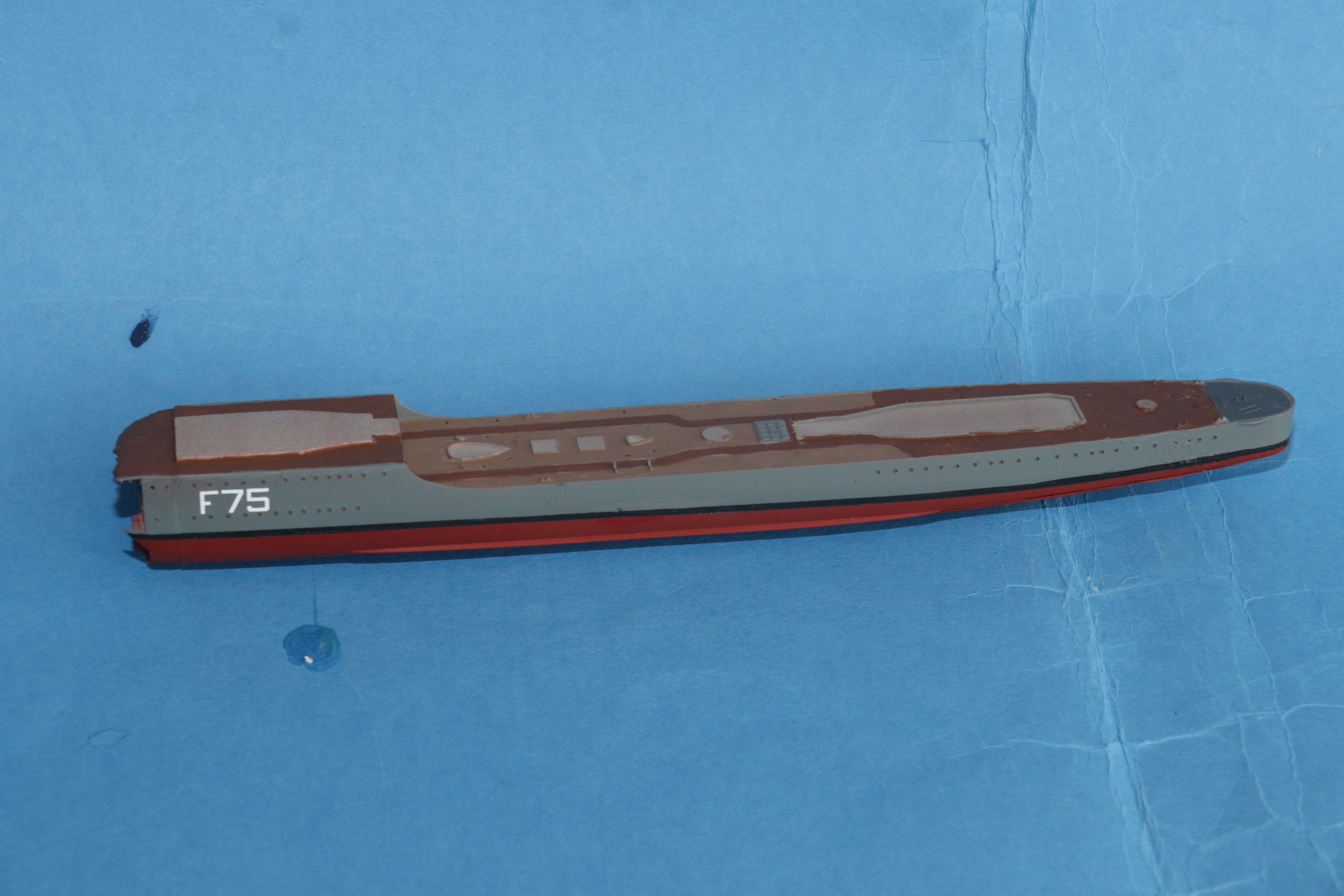 Paint starting to go on in the hole in the bow, I am not 100% about the colours, but they are based on the preserved WW2 ships HMS Belfast & HMS Cavalier. They will need quite a bit of dirtying down yet.