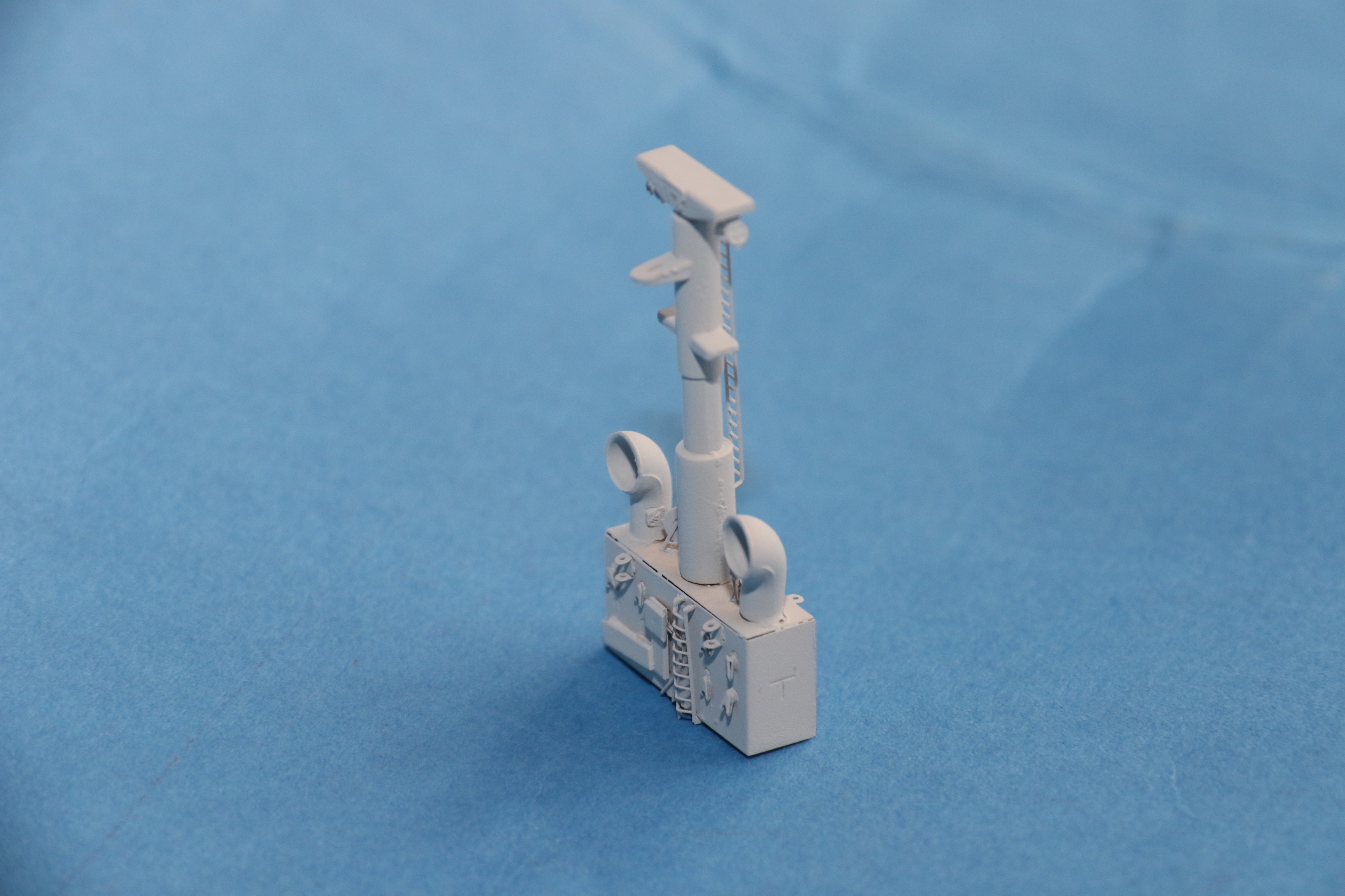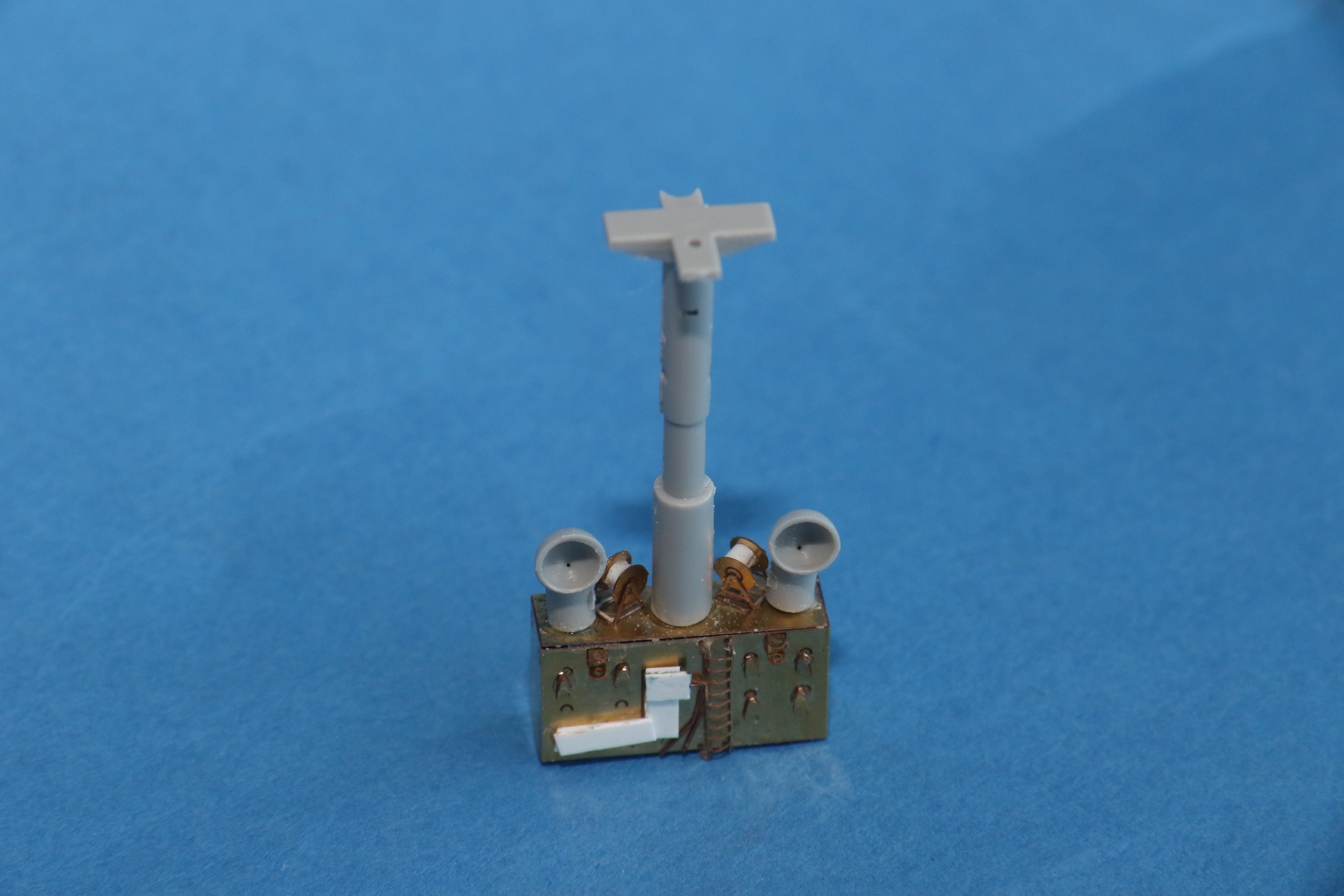 Final details fitted to the kingpost. some of the WW2 detail was removed, along with the mounting for the heavy lift derrick, and sprayed white.