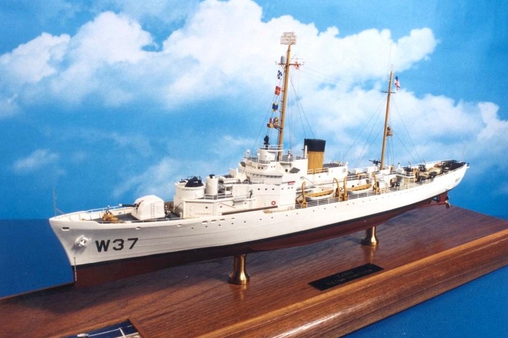 The final 327-foot (100 m) design was based on the Erie-class US Navy gunboats; the machinery plant and hull below the waterline were identical."