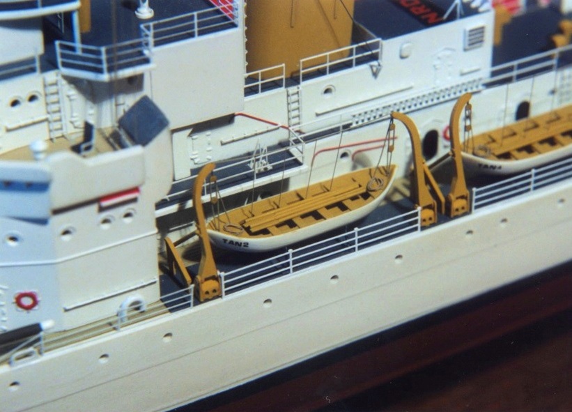 Where was the gangway stowed when not in use? The Revell kit shows two, one on each side at main deck level mounted outboard of the safety rails near the after bulwarks. Is this right? My overhead picture shows what looks like a solid object in that spot, but it may be a covered gangway as it is the right shape and length. The picture also clearly shows a heavy ladder-like object mounted horizontally outside the railing on the main deckhouse, abaft the funnel. Was that it? I know CAMPBELL had hers stowed there...