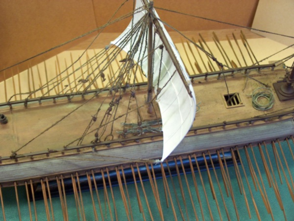 Unfortunately the sails were no cloth , plastic pieces that i primed, painted and treated with some white pigment to give them some texture .
