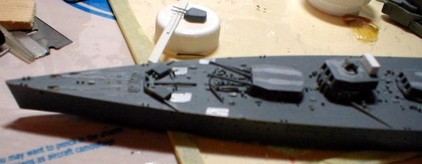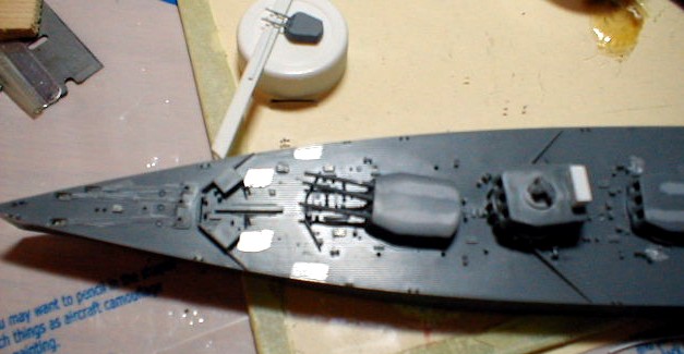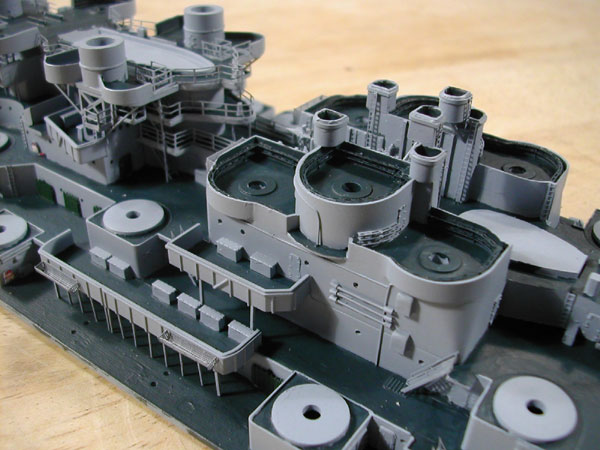 Ok, it is progress. It's just not on the scale and quality of some of the other shots. I've cleaned up the A turret and glued on the guns in salvo position. The B turret has the 40mm and the locker added. The X turret has the molded on 20mm's removed while I build up new tubs. I've also added a few hatches and a couple of 20mm's in front of the A turret.