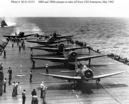 All 34 SBDs were spotted behind the fighters, and at the very end of the flight deck were 6 TBDs.  VT-8 only had 15 planes on board the carrier, and the remaining 9 were still below and only spotted on deck after all the other aircraft were clear.